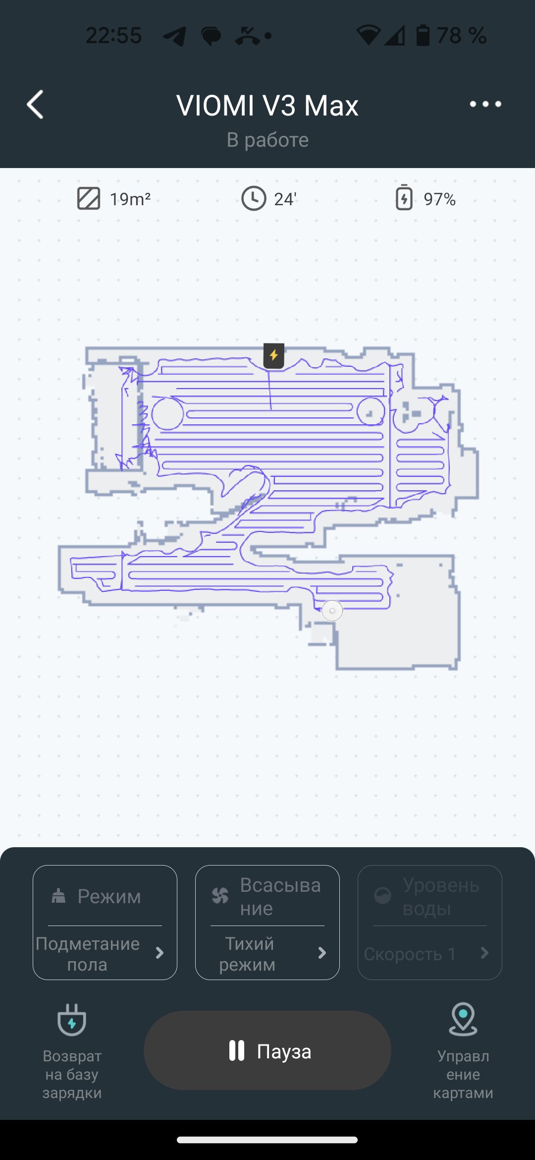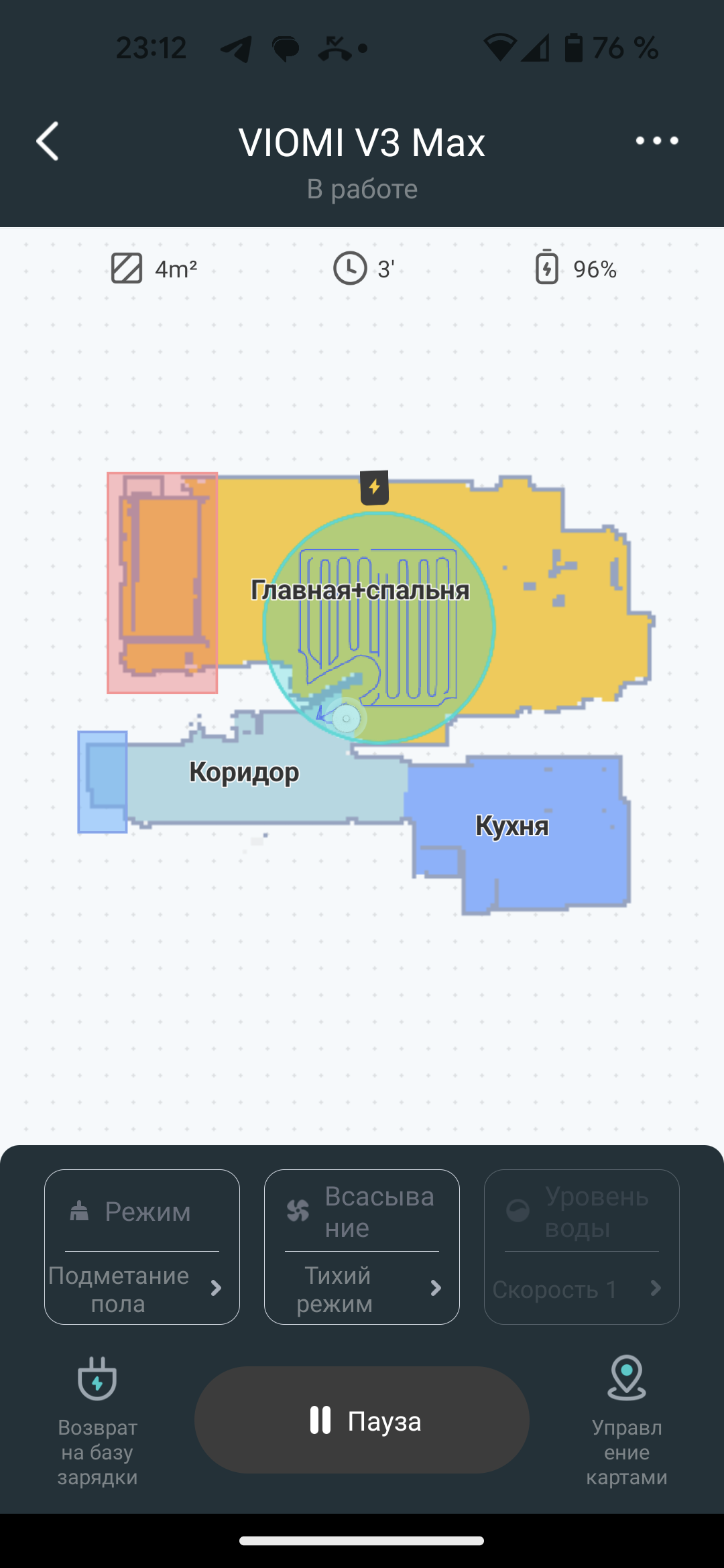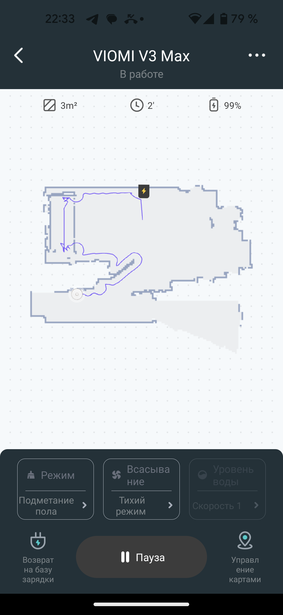 На главном экране приложения мы видим карту помещения, создаваемую с весьма высокой точностью: LDS-сенсор позволяет определять расположение стен и мебели с точностью до миллиметров. В верхней части экрана можно следить за состоянием аккумулятора и оценивать площадь, убранную пылесосом в текущем цикле работы.