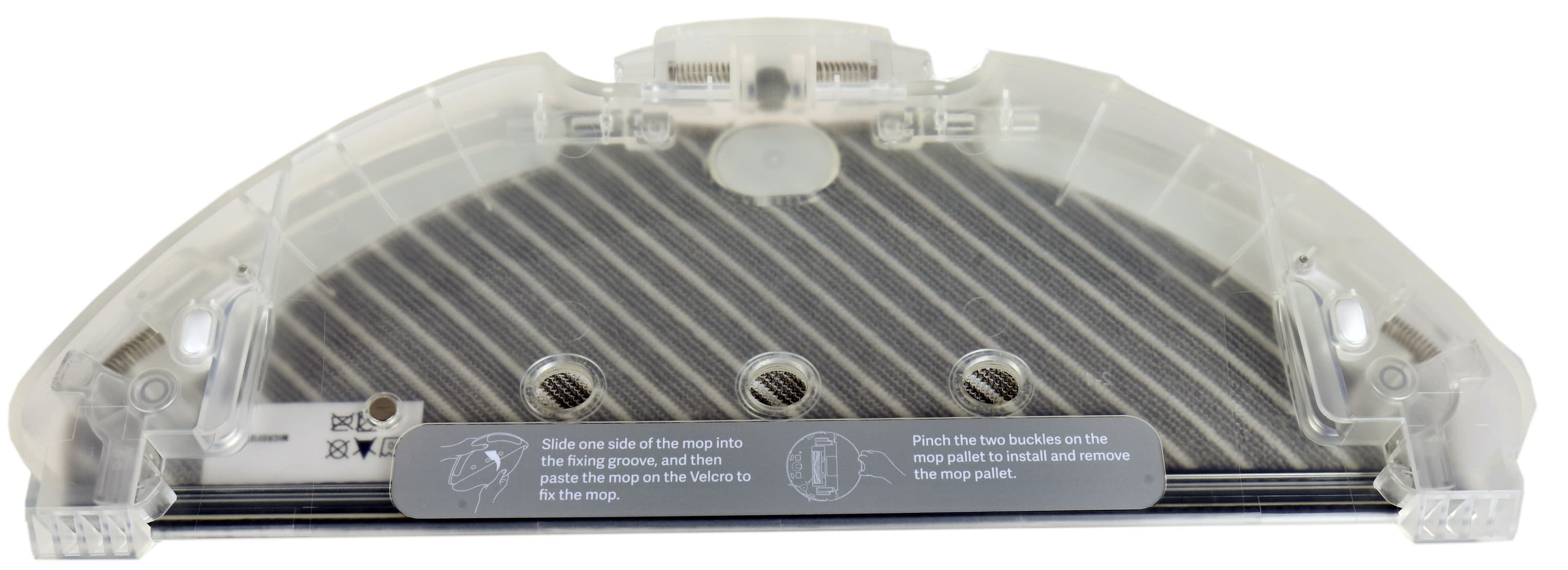 Держатель тряпки сделан из полупрозрачного пластика. Задняя часть салфеток пристегивается к нему с помощью липучек-велкро, а передняя задвигается в специальный паз: внутри прямой стороны D-образных салфеток скрыт жесткий элемент, усиливающий крепление.