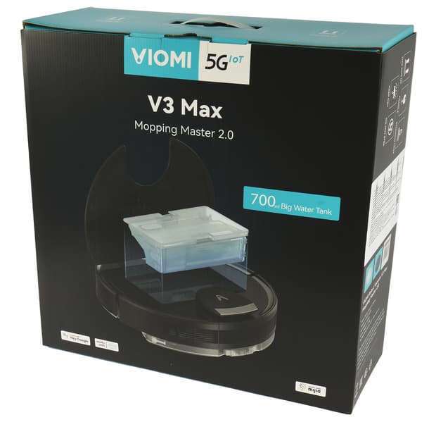 Пылесос упакован в черно-бирюзовую картонную коробку с ручкой. Спереди и сзади производитель разместил цветные изображения робота. Рассматривая их и читая сопутствующие надписи, можно сделать вывод, что прибор оснащен большим (700 мл) резервуаром для воды, поддерживает экосистему Mija и умеет работать с голосовыми помощниками: Ассистентом от Google и Alexa.