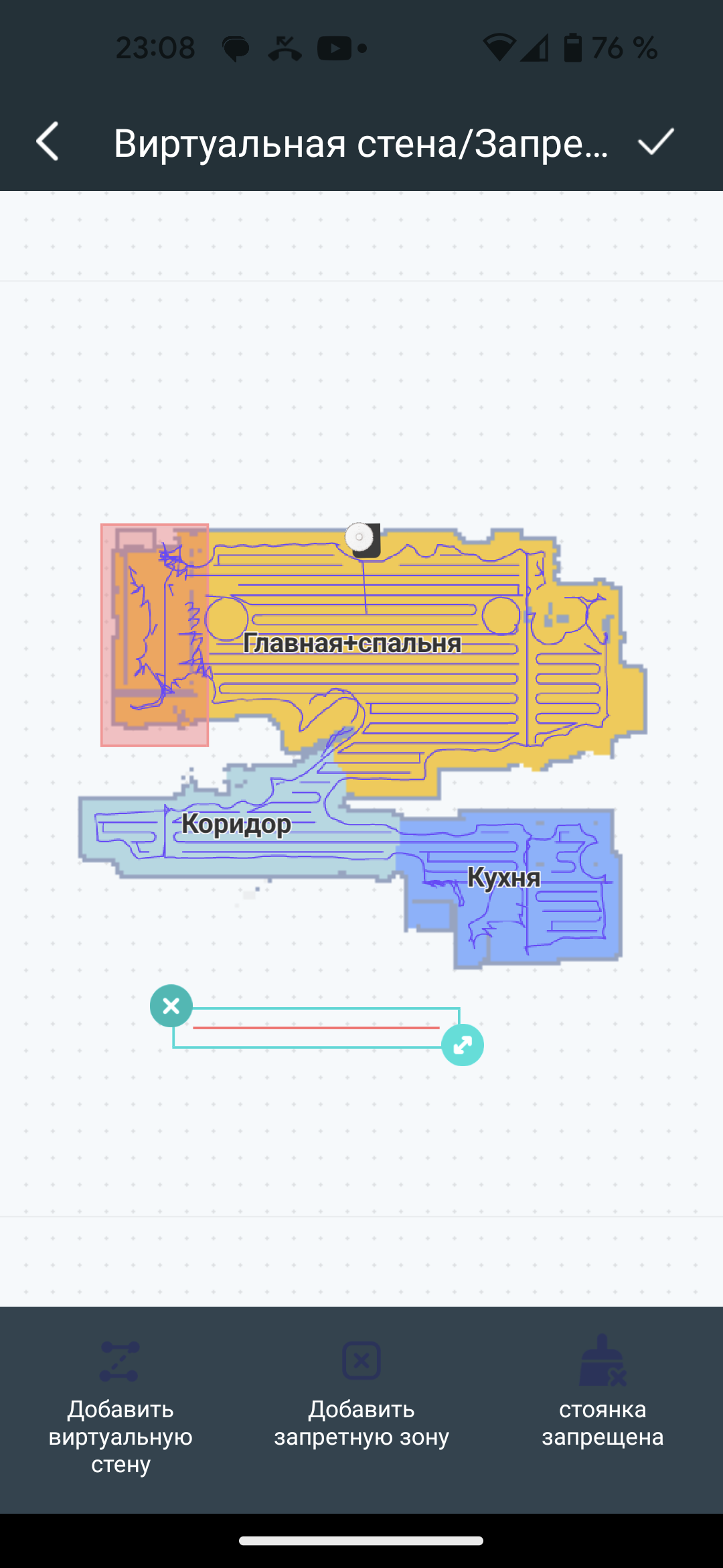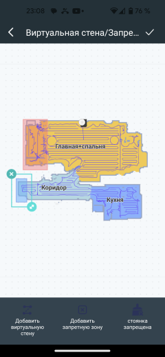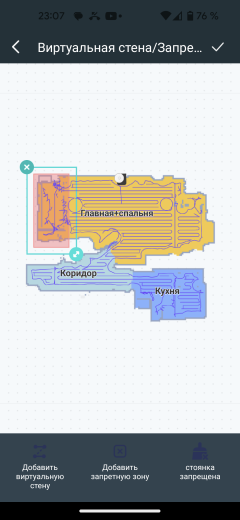 Здесь же можно установить запретные для пылесоса зоны с помощью трех инструментов: «виртуальной стеной» нарисовать на карте непреодолимую для робота границу, с помощью «запретной зоны» создать прямоугольную область, в которой присутствие прибора нежелательно, а инструментом с забавным названием «стоянка запрещена» установить участок, на котором не надо протирать полы.
