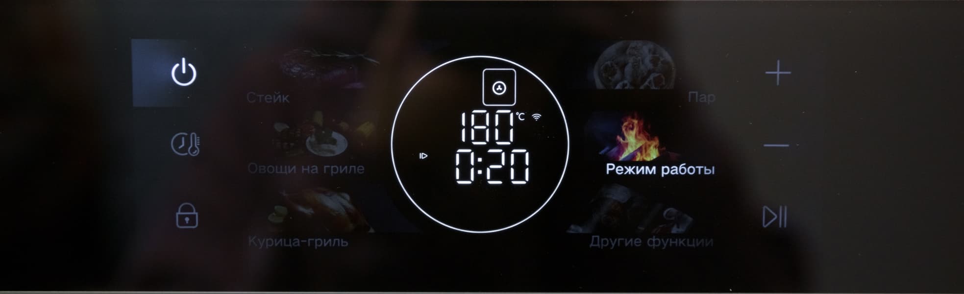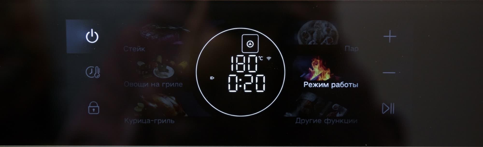 В процессе нагрева на дисплее отображается фактическая температура внутри камеры. В момент, когда она достигает заданного уровня, звучит мягкий негромкий сигнал и начинается обратный отсчет времени программы. Сигналы также раздаются при нажатии на кнопки при выставлении параметров и в конце цикла приготовления. Звуковое сопровождение не отключается, но громкость и характер звучания дискомфорта не вызывают.