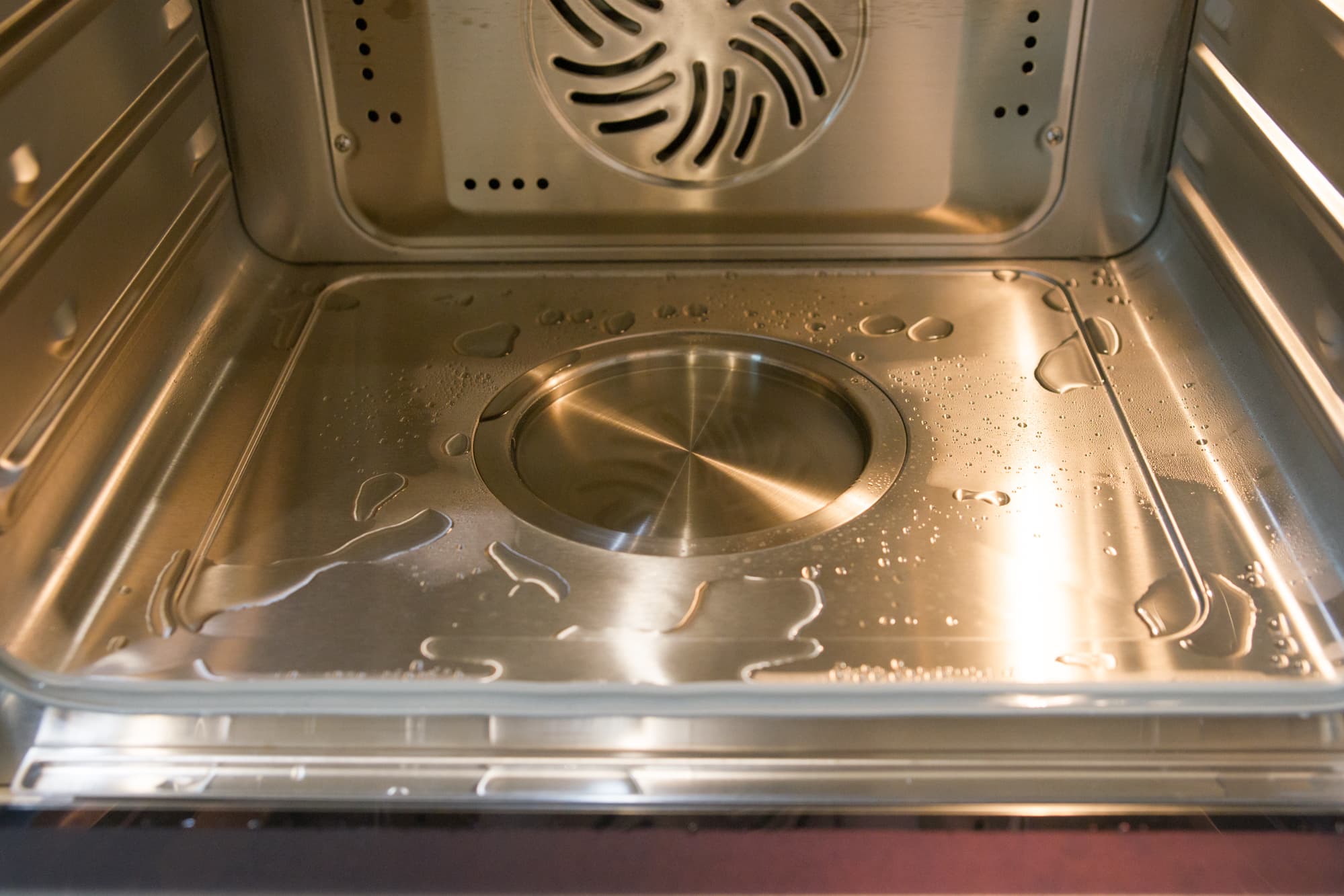 После приготовления на пару́ в углублении на дне духовки и вокруг него остается вода, которая легко удаляется при помощи объемной мягкой губки.