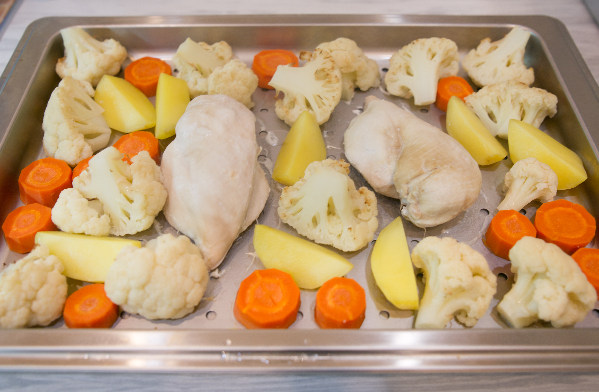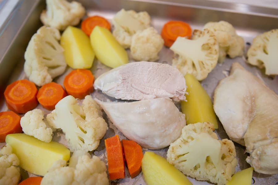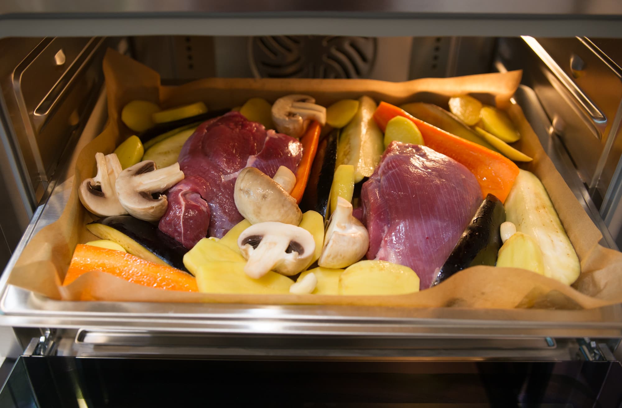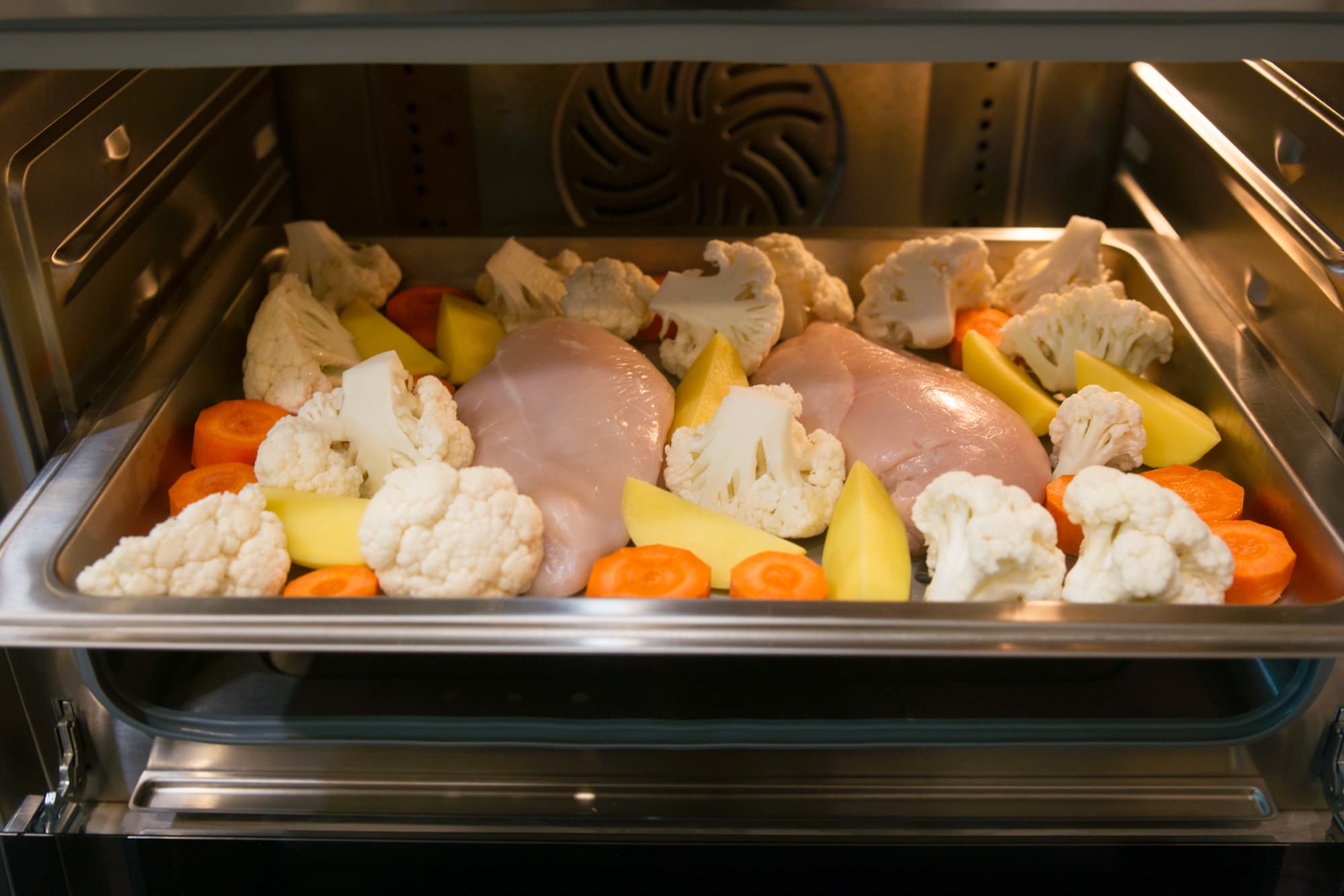 Для овощей и куриного филе мы выбрали Длительное приготовление на пару́ при 110 °C на 30 минут. Этого времени хватило, чтобы все продукты на противне полноценно приготовились и остались сочными.