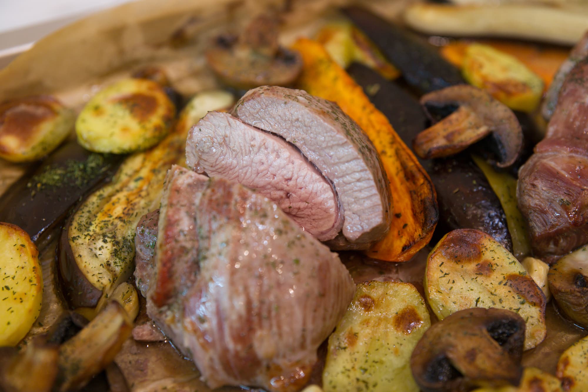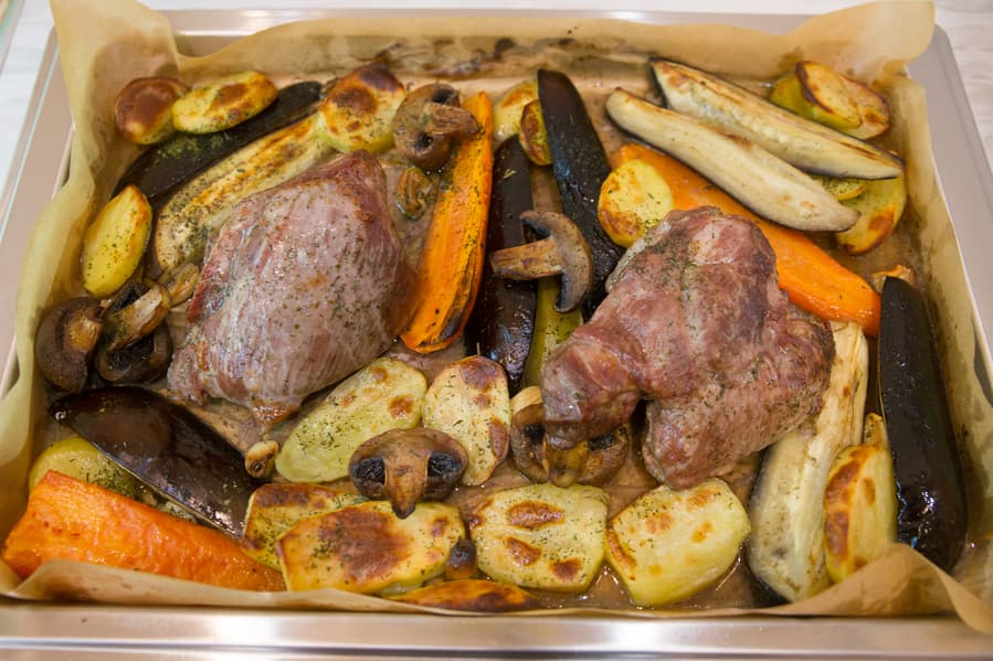 Запеченные овощи, шампиньоны и бедро индейки