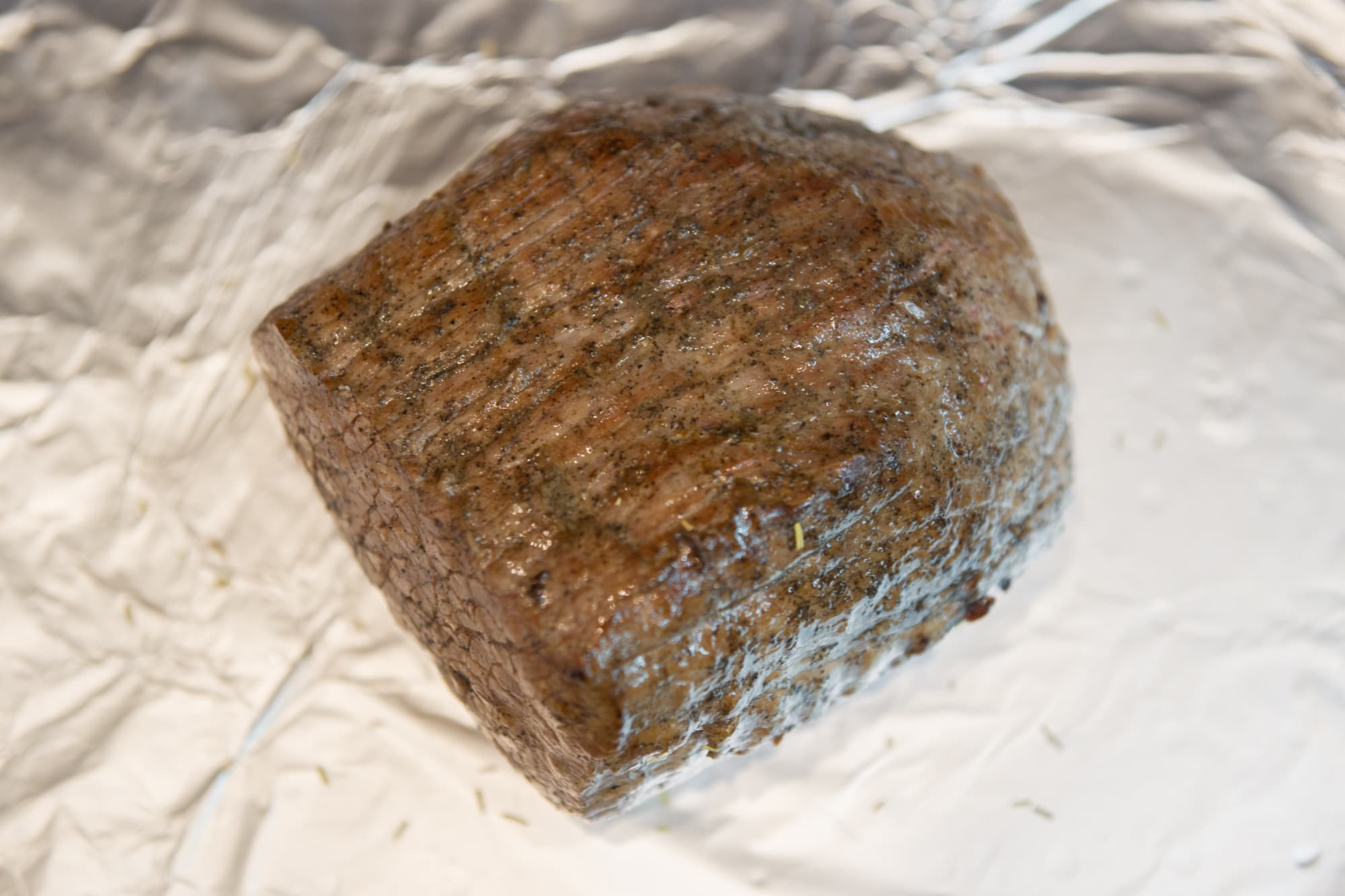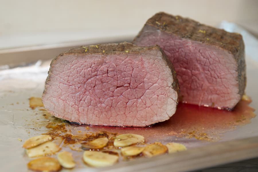 Кусок филейной части говядины весом около 1,3 кг сначала смазали растительным маслом, затем натерли солью с перцем и «запечатали» со всех сторон на раскаленном гриле. Благодаря этому действию сок удерживается внутри куска на протяжении всего цикла запекания.