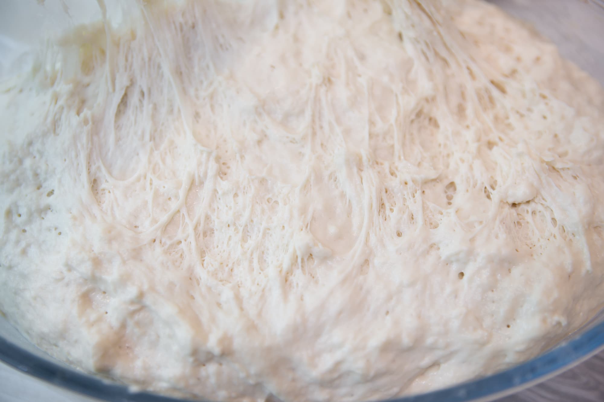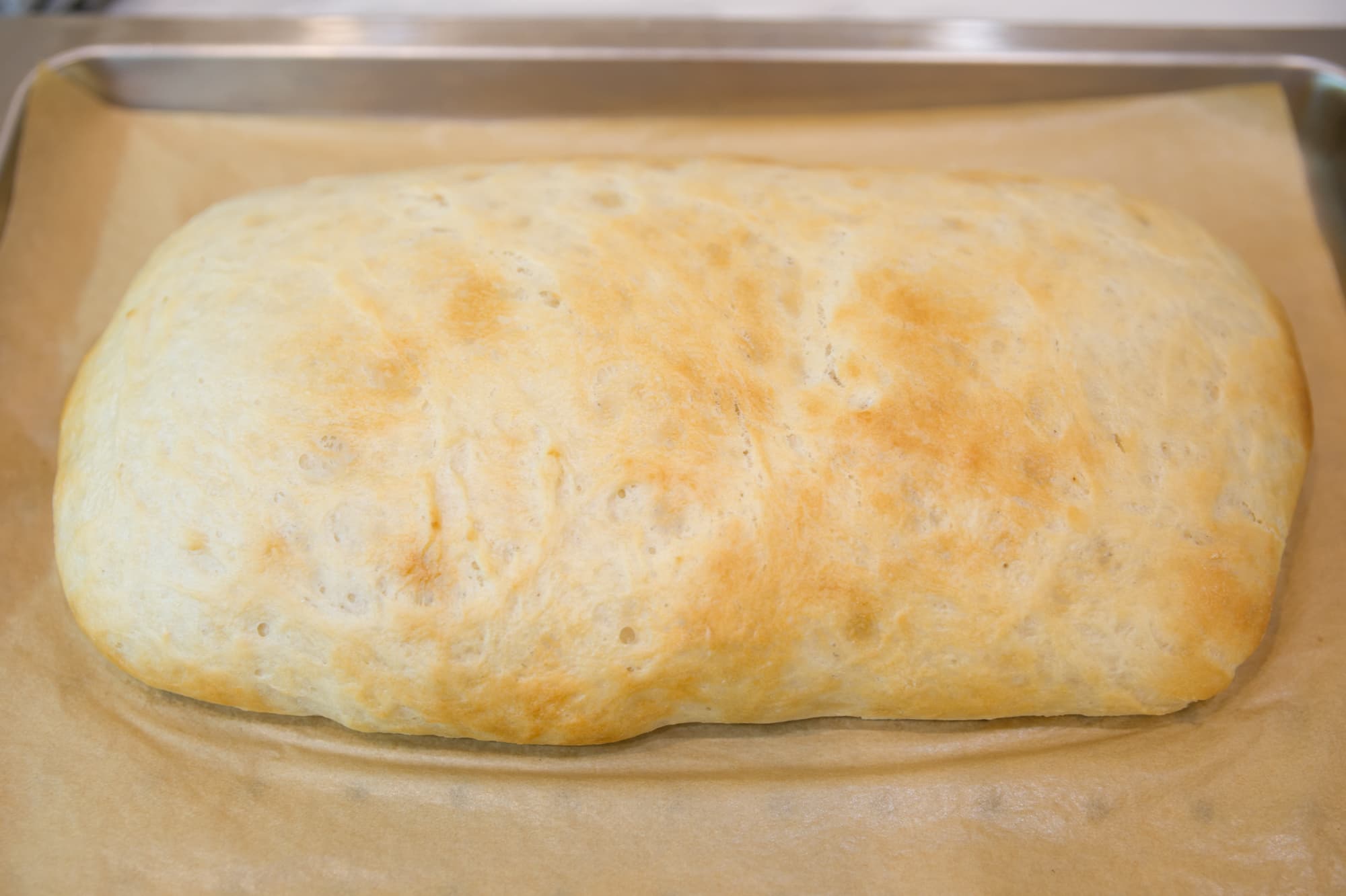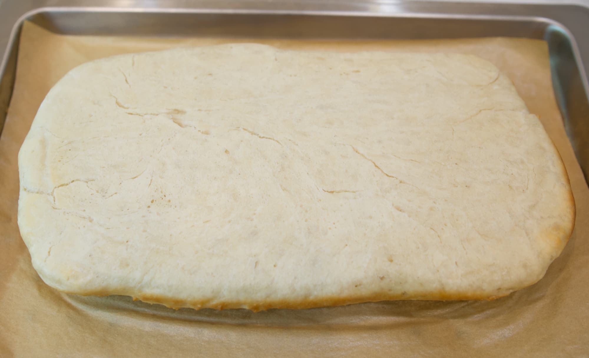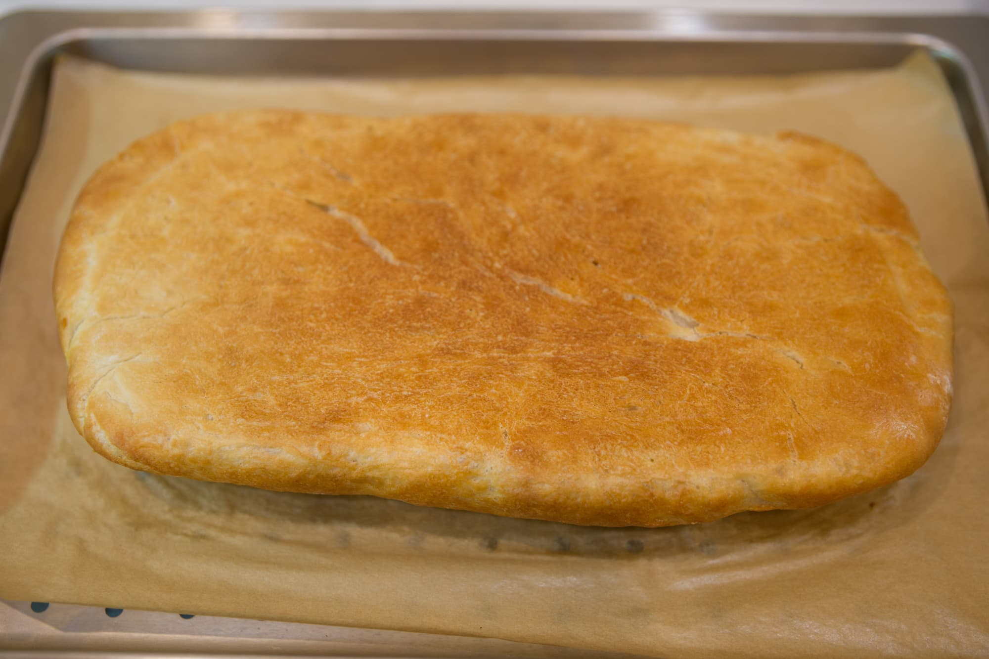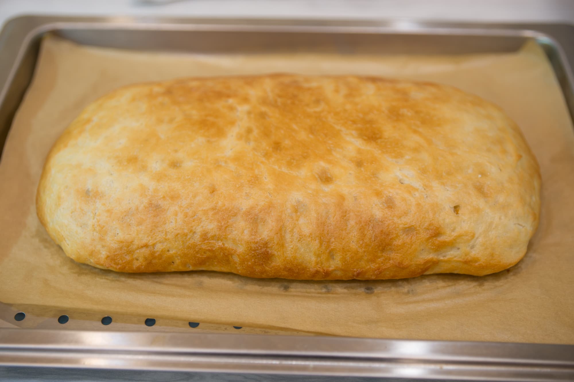 Мы обмяли его со всех сторон и поставили на расстойку еще раз в том же режиме. После повторного увеличения перенесли тесто на противень с отверстиями, сформировали относительно плоскую лепешку и отправили будущий хлеб в камеру.