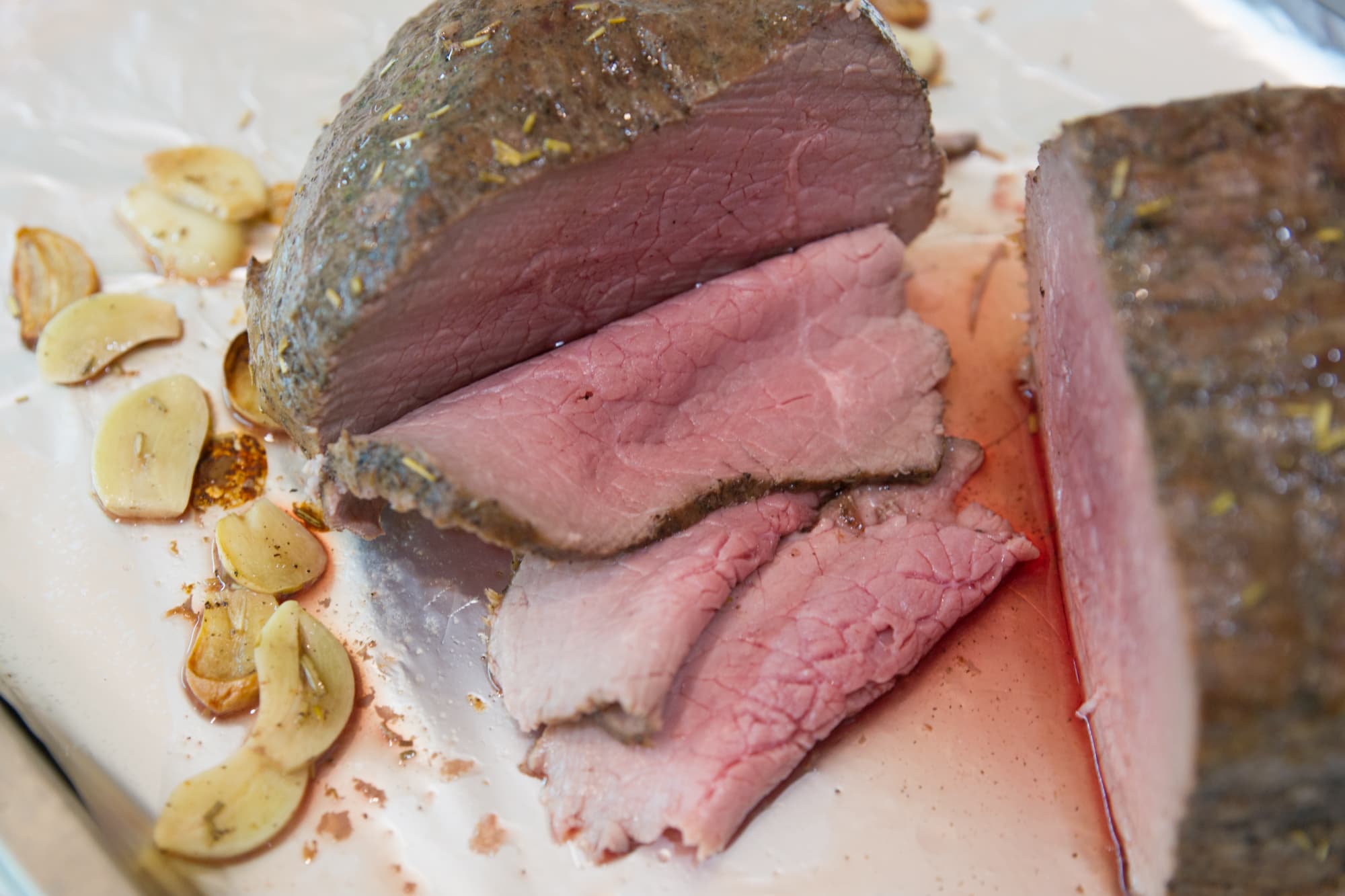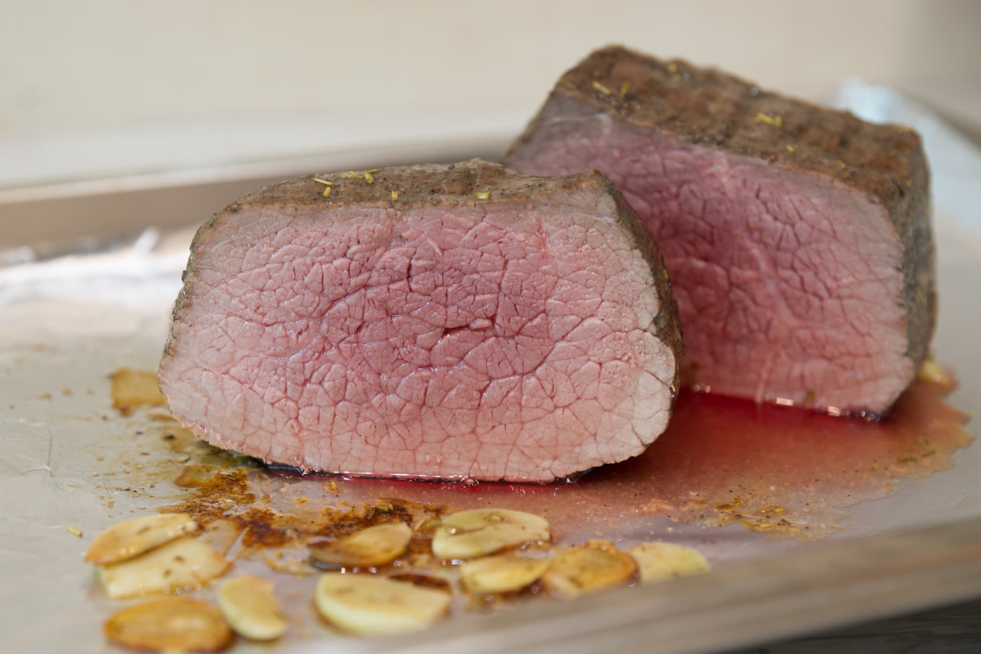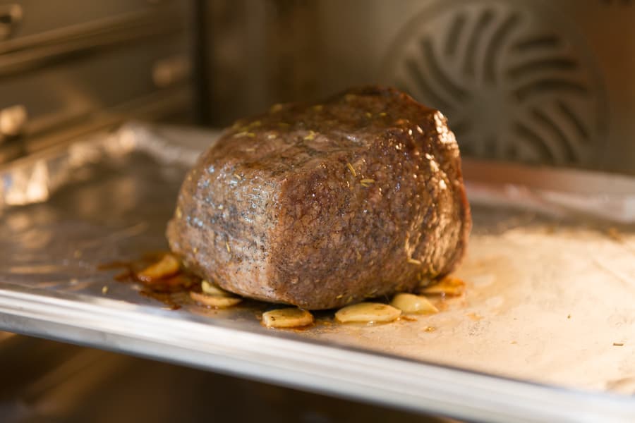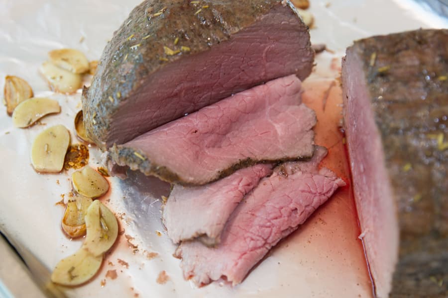 Внутрь воткнули термощуп и выставили на нем 50 °C. В середине процесса один раз перевернули кусок. После сигнала термощупа выключили духовку и оставили мясо еще ненадолго внутри.