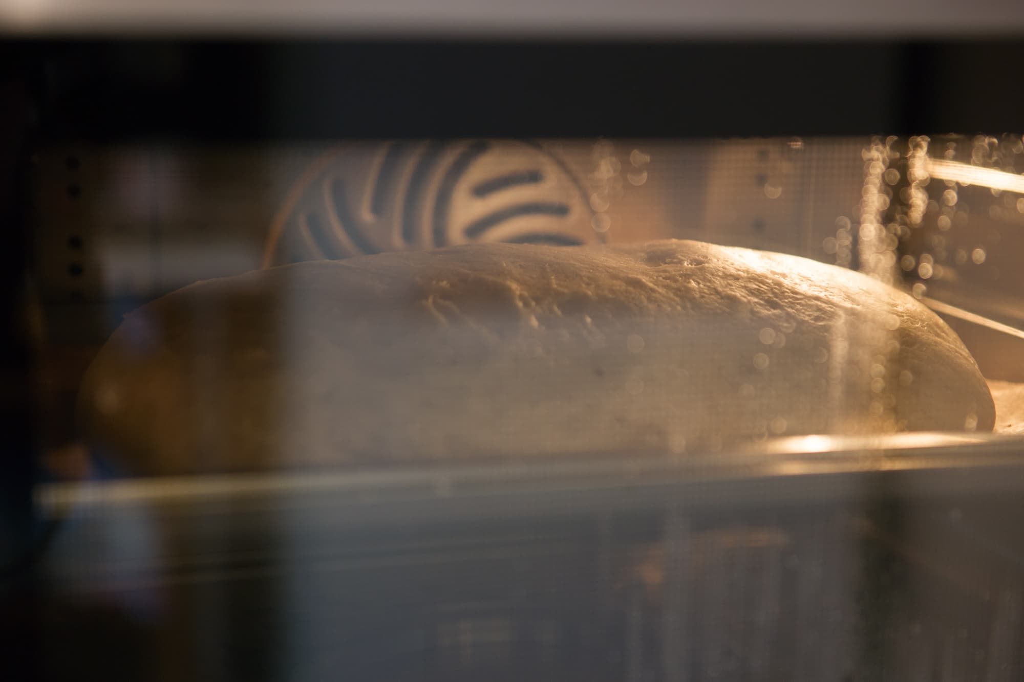 Осталось решить, на каком режиме его выпекать. В идеале нужен был верх + низ без конвекции с подачей пара в начале цикла, но такого варианта у нашей духовки не оказалось, поэтому пришлось выкручиваться. Для начала включили Длительное приготовление на пару́ при температуре 100 °C на 5 минут. За это время буханка успела хорошо подрасти.