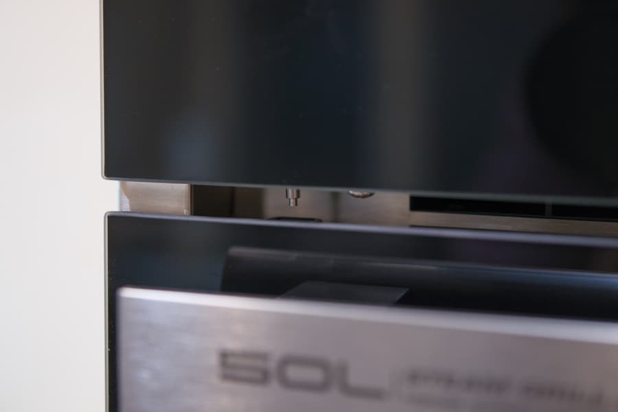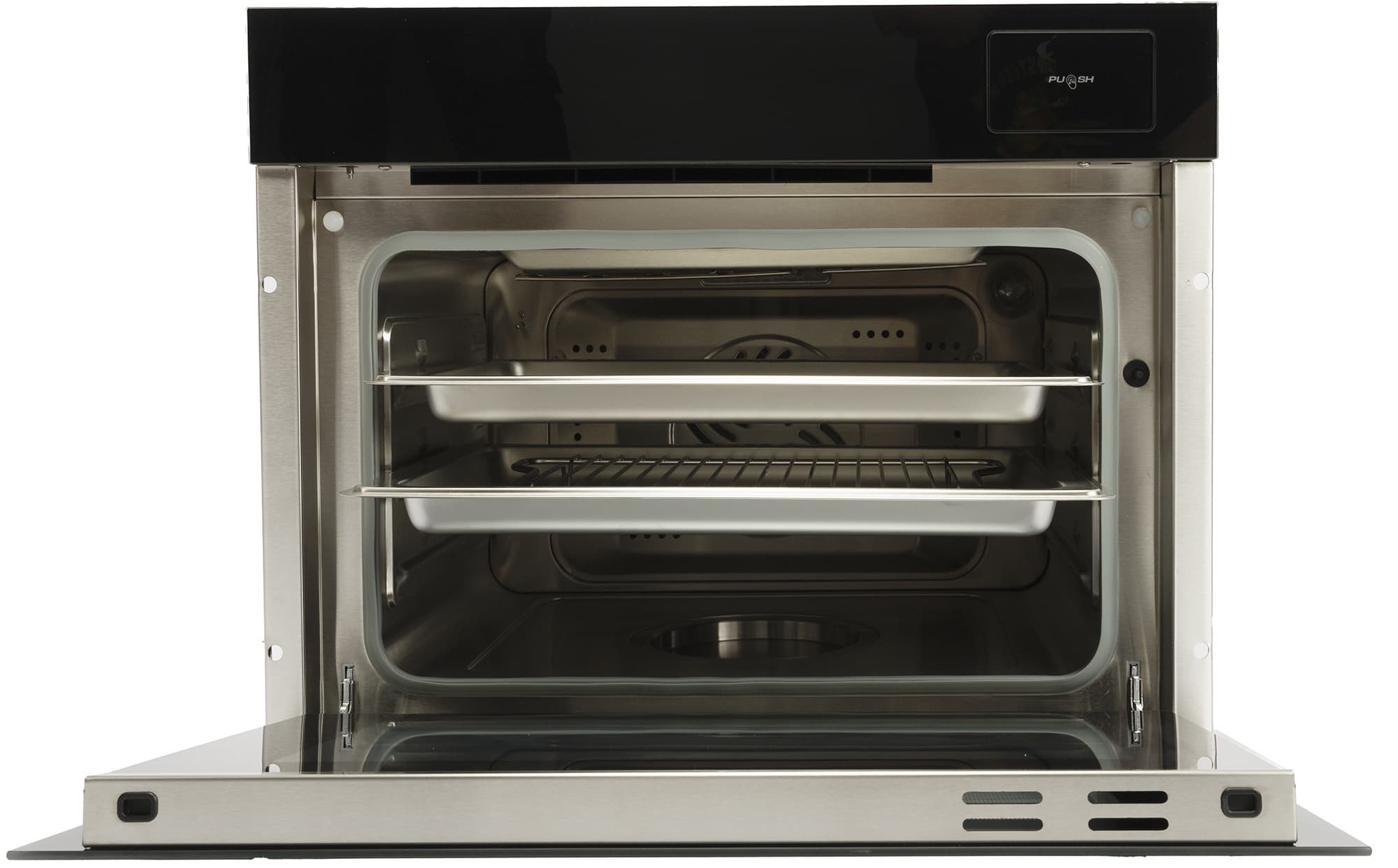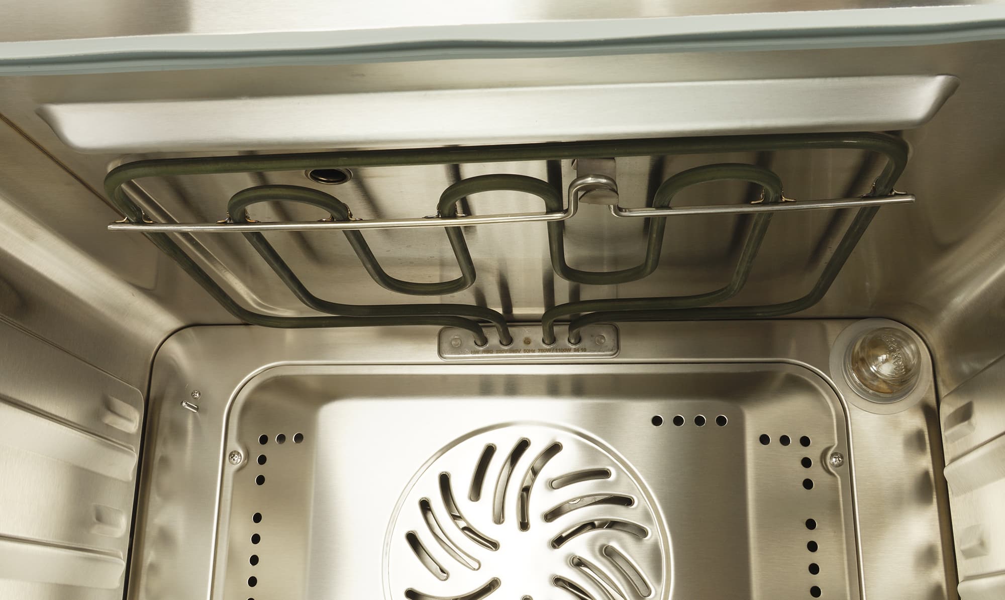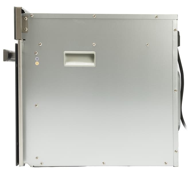 50-литровая рабочая камера покрыта нержавеющей сталью. На задней стенке мы видим решетку вентилятора. Вокруг нее — небольшое количество круглых отверстий. В правом верхнем углу виднеется лампочка, освещающая камеру во время работы. На боковых стенках — выпуклые направляющие, для установки емкостей на трех уровнях.