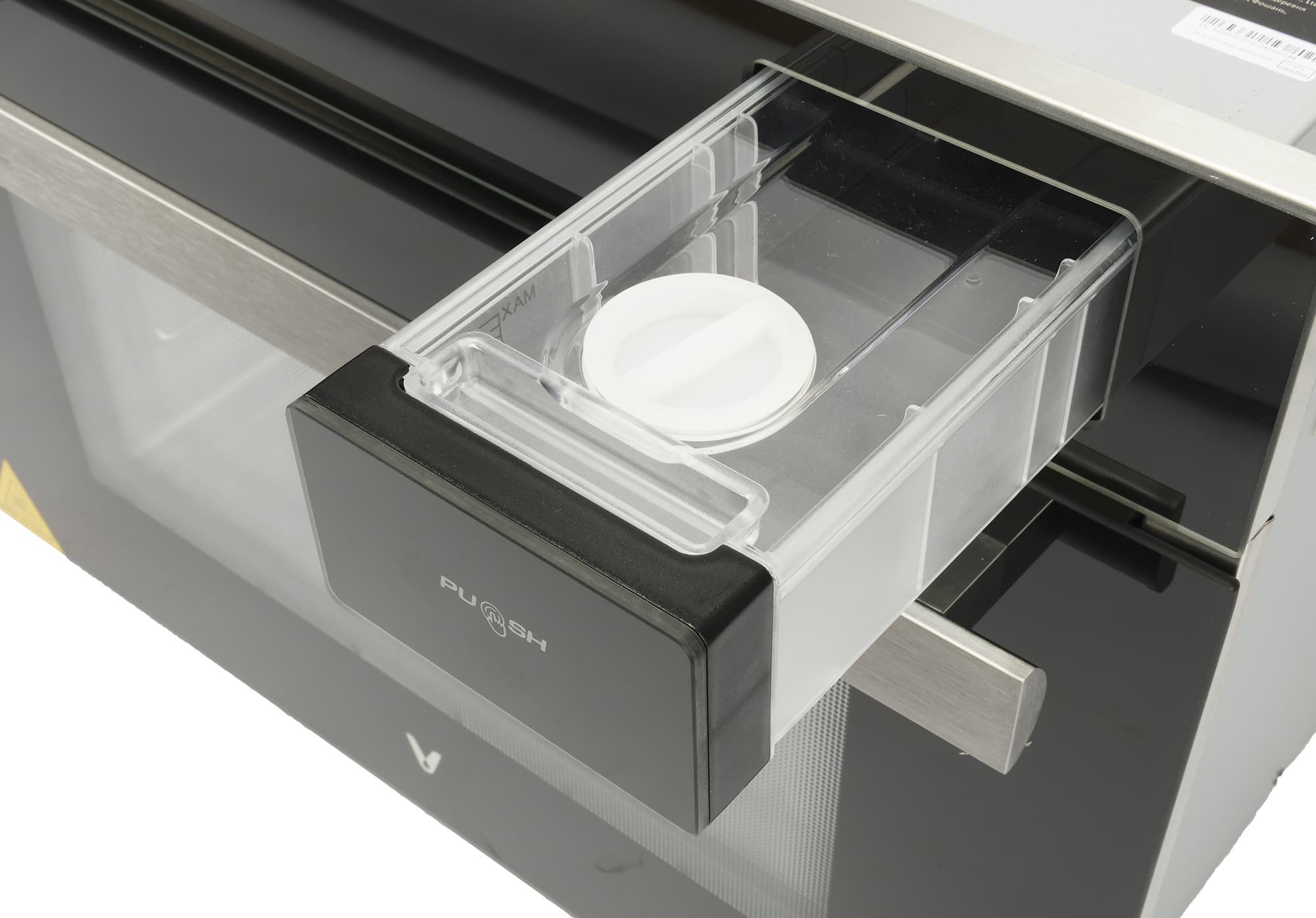 Сенсорная панель управления с дисплеем расположена привычно, в верхней части. Справа от нее размещен выдвижной резервуар для воды объемом 1,2 л. Выдвигается емкость при нажатии на клавишу. При необходимости резервуар вынимается целиком.