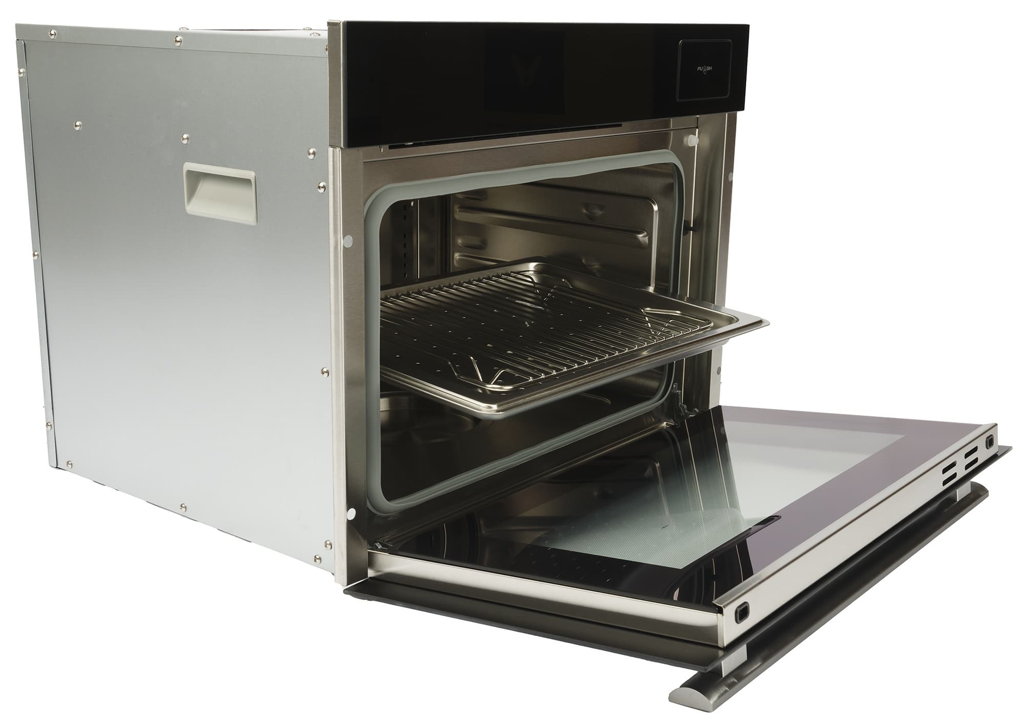 Съемная дверца с тройным остеклением плавно открывается вниз.