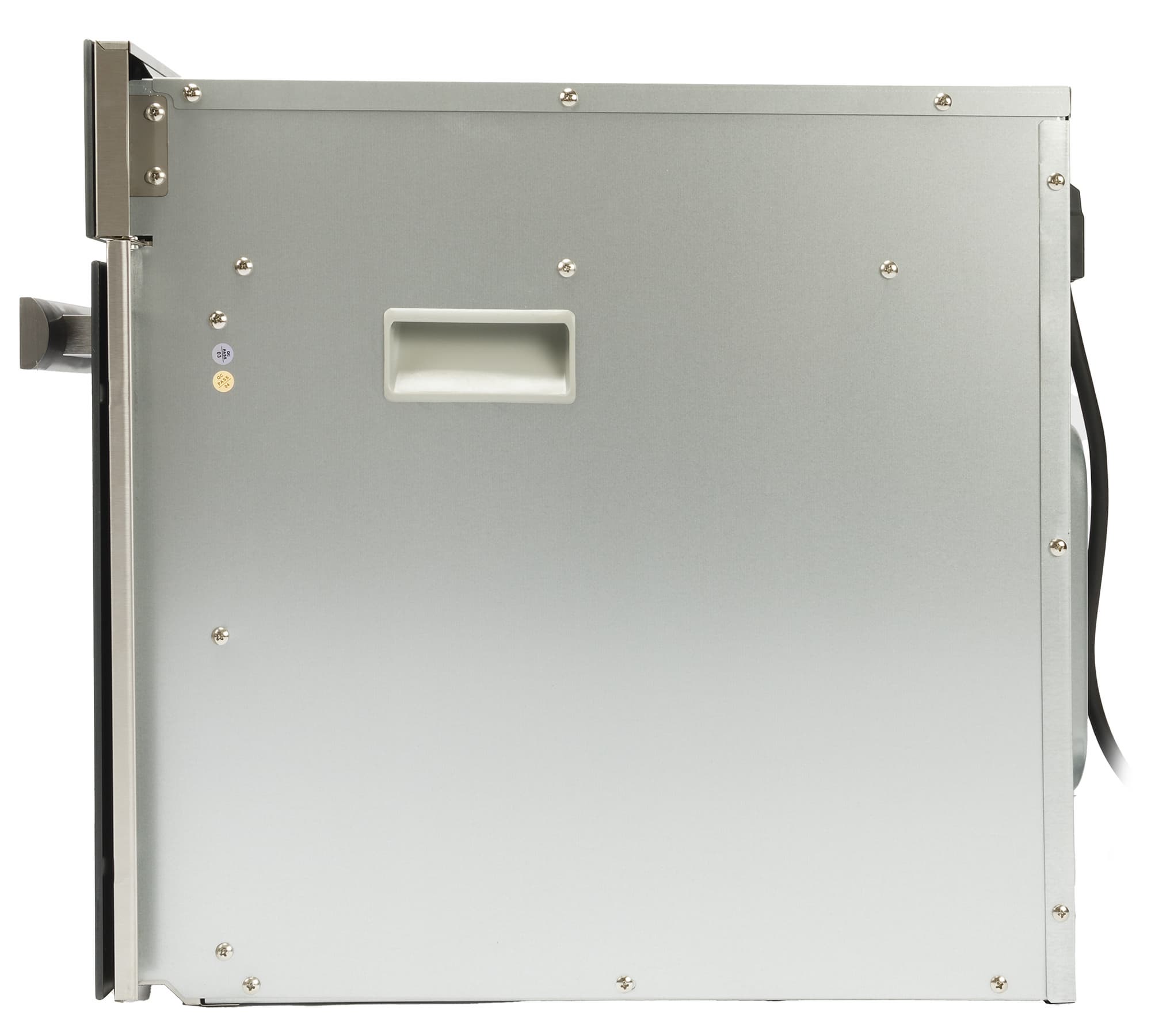 На глянцевом покрытии лицевой части выделяется матовая металлическая ручка. Большую часть дверцы занимает умеренно затемненное смотровое окошко, а под ним — небольшой логотип бренда.