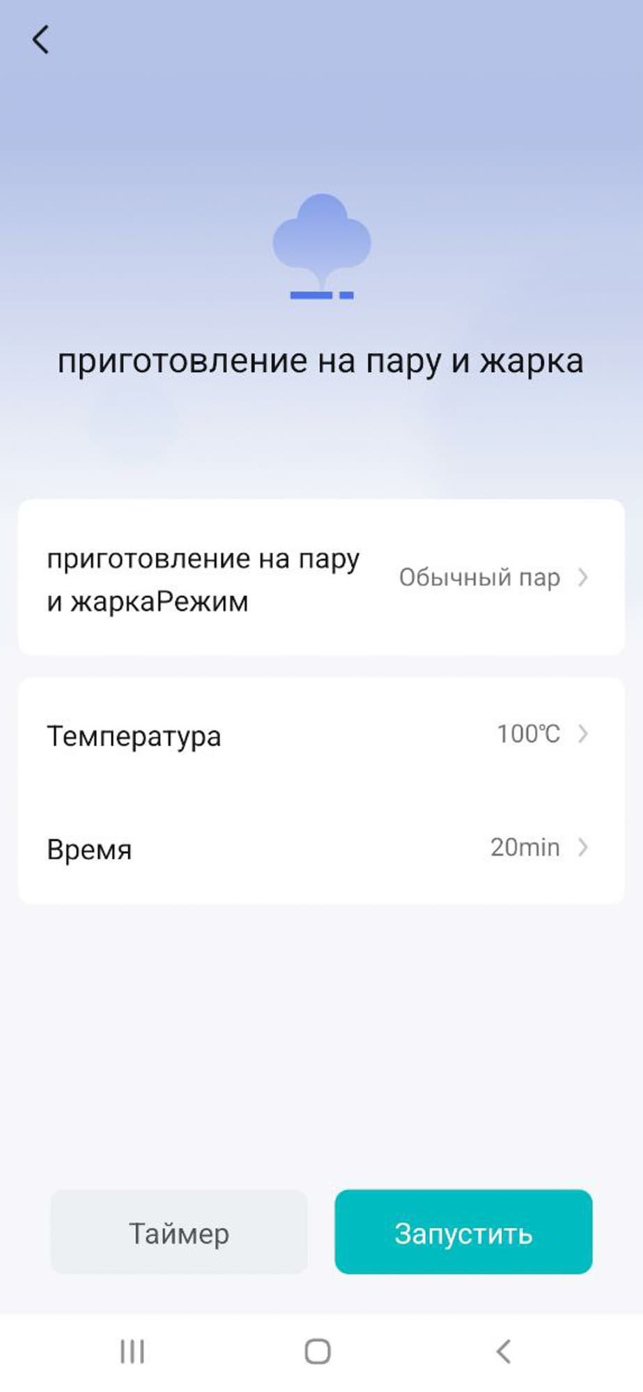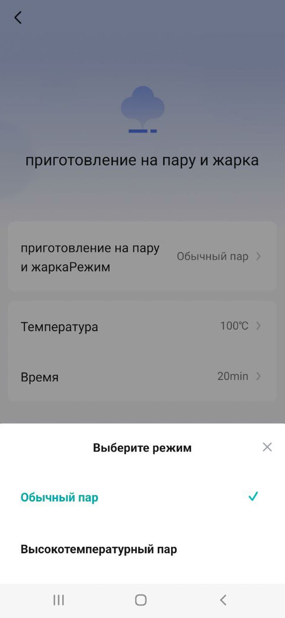 - Пар — режим Обычное варение при 50—100 °C на 20 минут или при 110 °C на 20 минут
