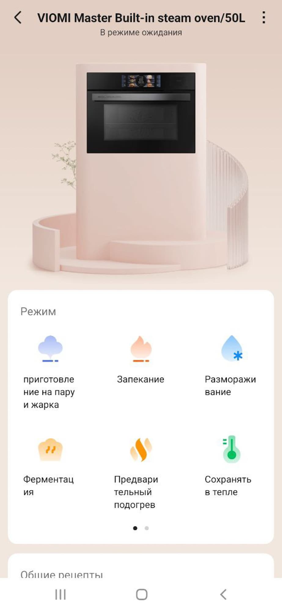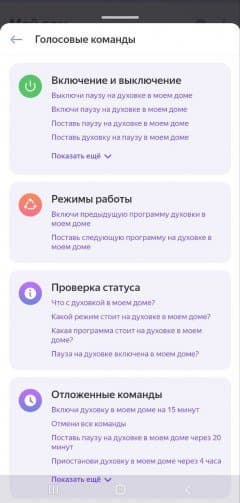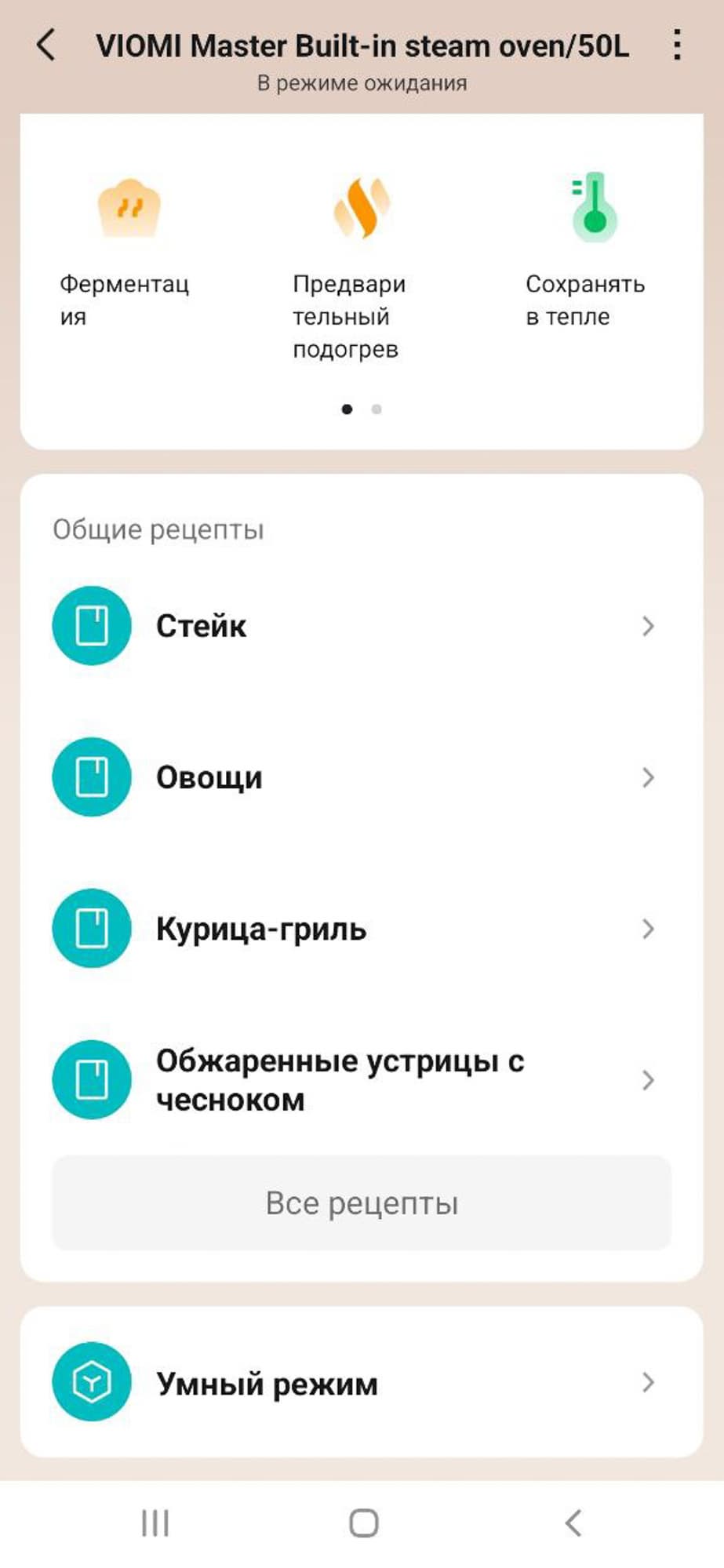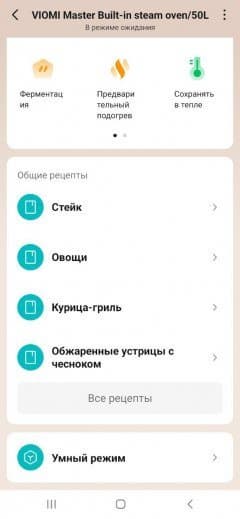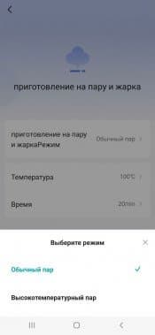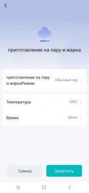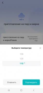 Здесь можно выбрать любой режим, произвести предварительную корректировку параметров, запустить программу, при необходимости поставить ее на паузу или прервать. В целом, все, как и на панели устройства, с той лишь разницей, что в мобильной версии гораздо больше сценариев приготовления с предустановленными настройками.