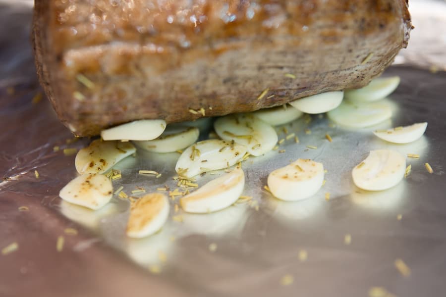 Духовка к этому моменту разогрелась в режиме конвекции с кольцевым нагревателем до 160 °C. Противень застелили фольгой, выложили в центр пластинки чеснока и присыпали их небольшим количеством сухого розмарина. Сверху уложили мясо.