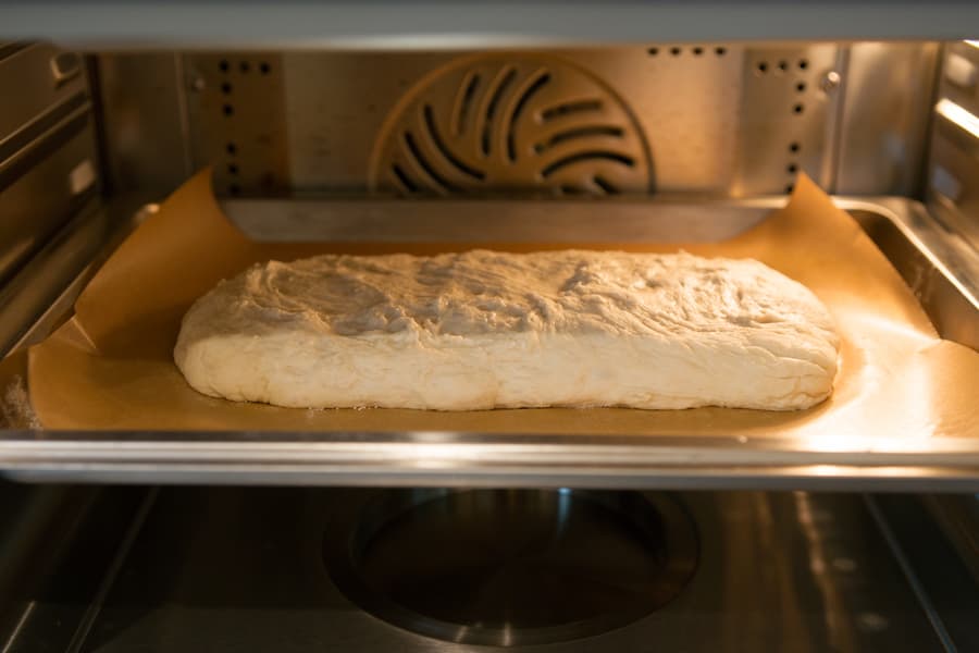 В 350 мл теплой воды развели 8 г сухих дрожжей и 1,5 чайных ложки сахара. Накрыли емкость пленкой и оставили на 15 минут для активации дрожжей. В отдельную миску просеяли 400 г пшеничной муки, добавили 1,5 чайных ложки соли и перемешали. Убедившись, что дрожжи сработали, влили их в муку и замешали тесто. Для расстойки мы воспользовались режимом Ферментация. Параметры, установленные духовкой по умолчанию, менять не стали — 40 минут тесто под пленкой подрастало при температуре 35 °C.