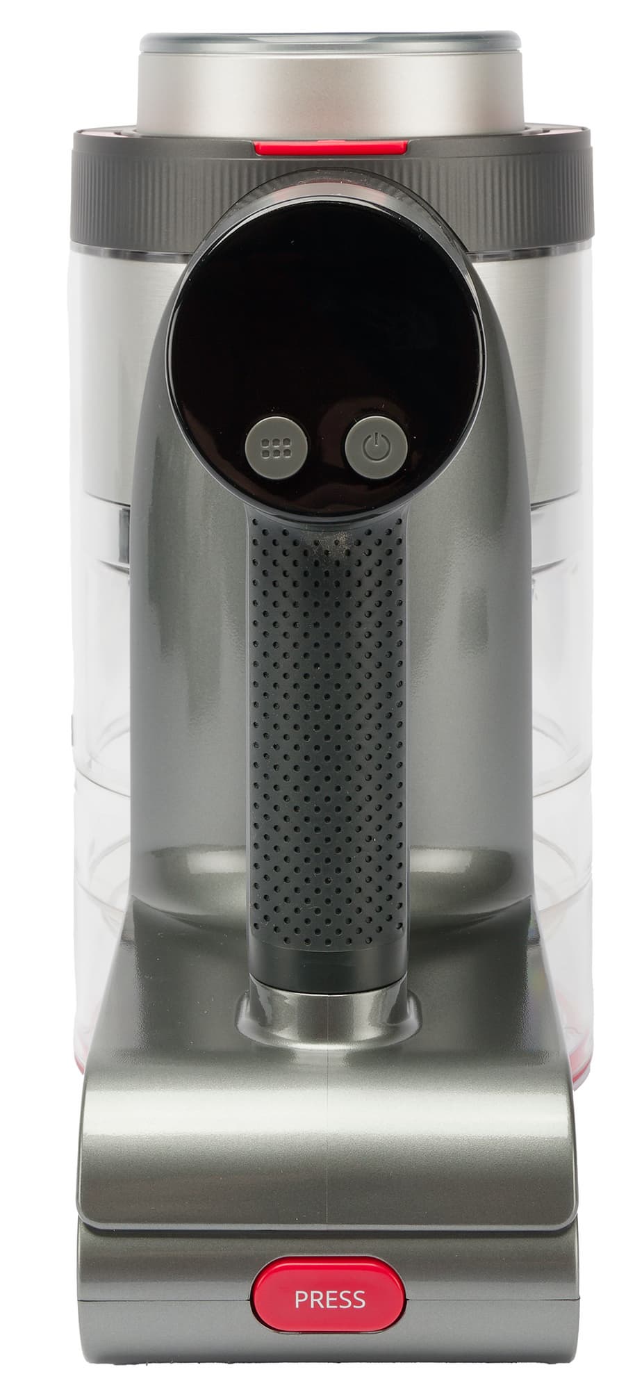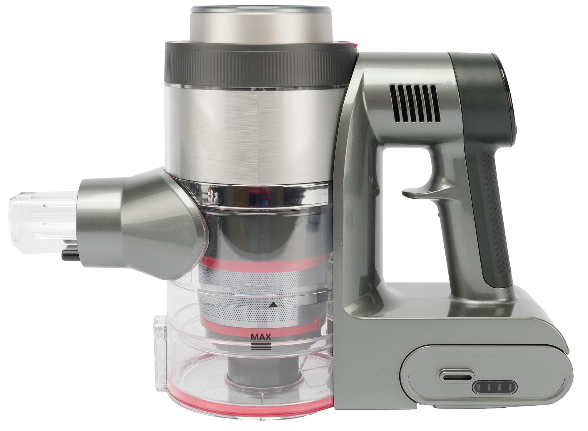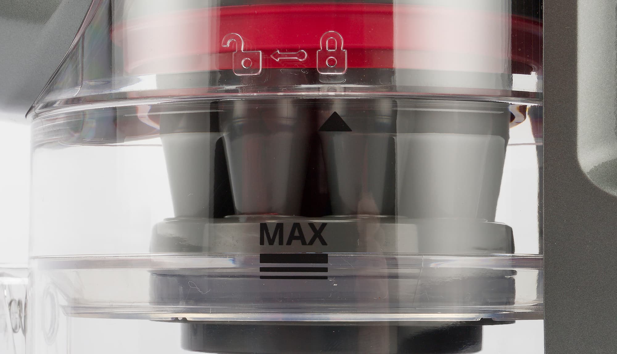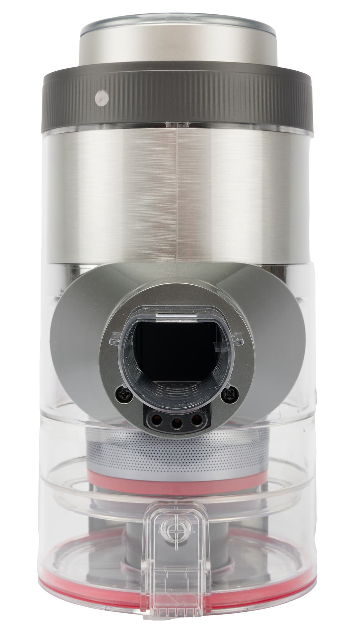Прозрачные стенки пылесборника позволяют хорошо видеть его содержимое. Мусор скапливается в нижней части контейнера, не блокируя стальную сетку. При необходимости сетку можно очистить, не вскрывая емкость: для этого служит подвижный слайдер, управляемый полукруглой ручкой на верхней стороне.