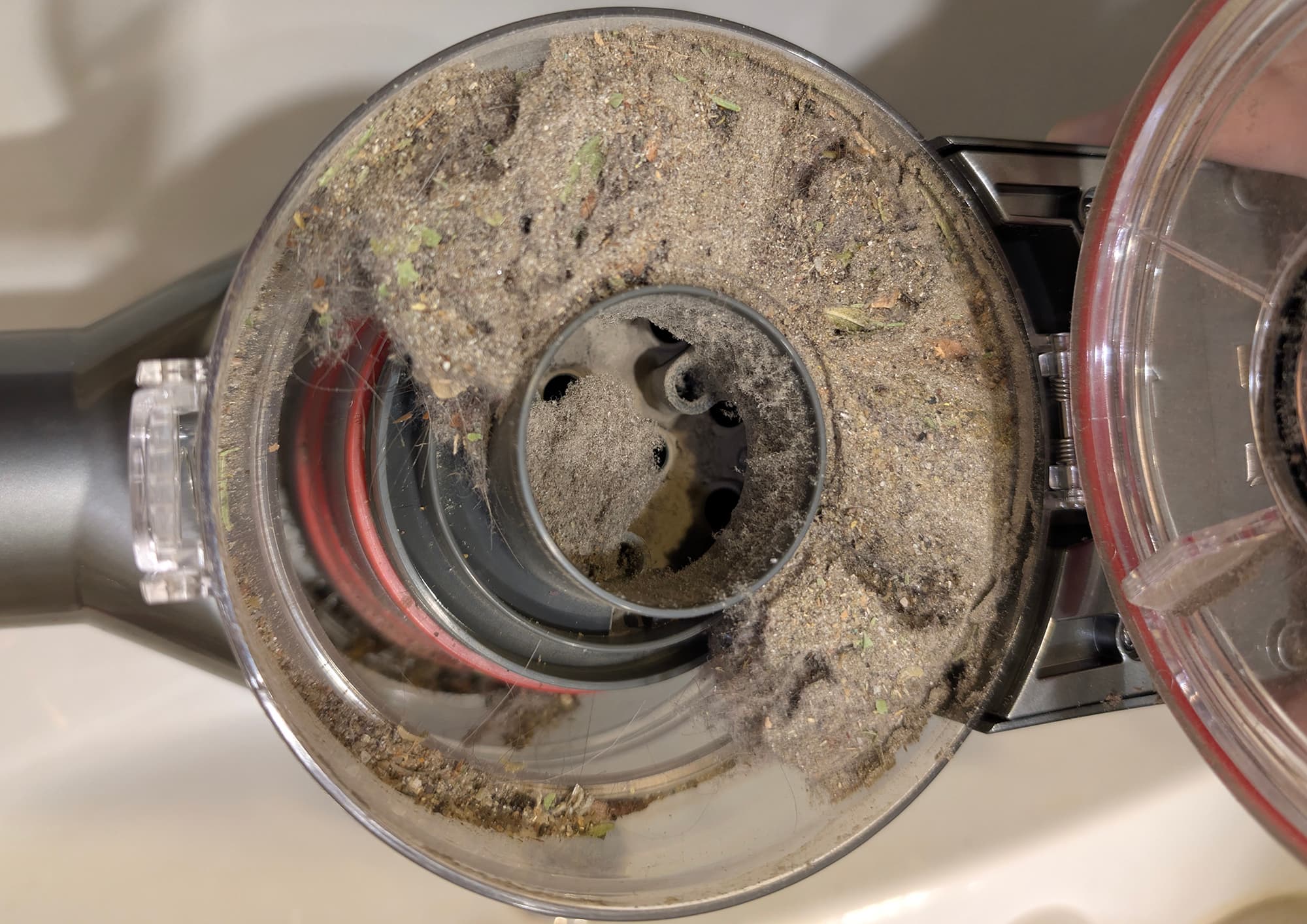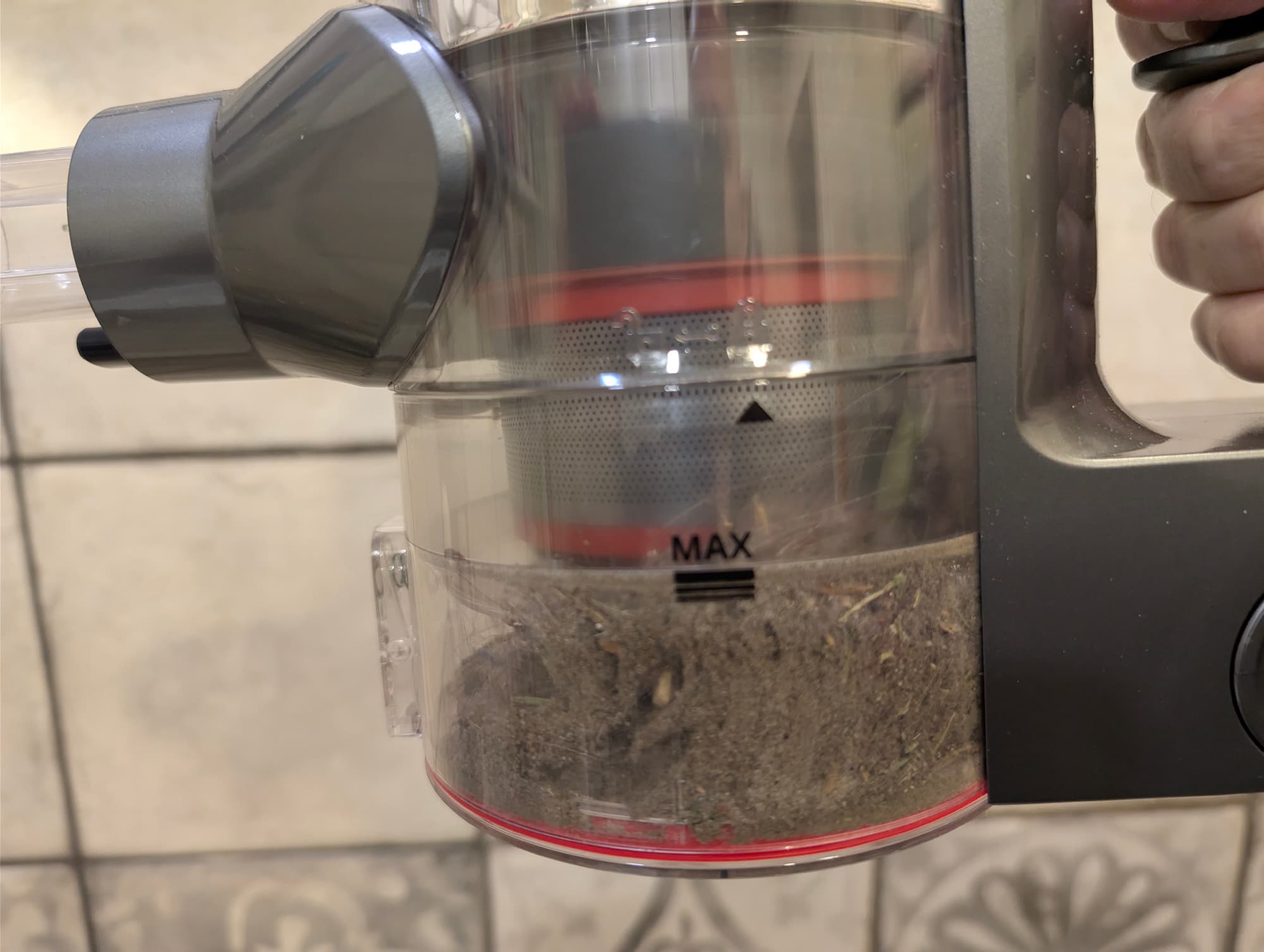 Основная часть мусора остается в контейнере и внутри пластикового мультициклона: до фильтра тонкой очистки долетает очень немного самой мелкой пыли.