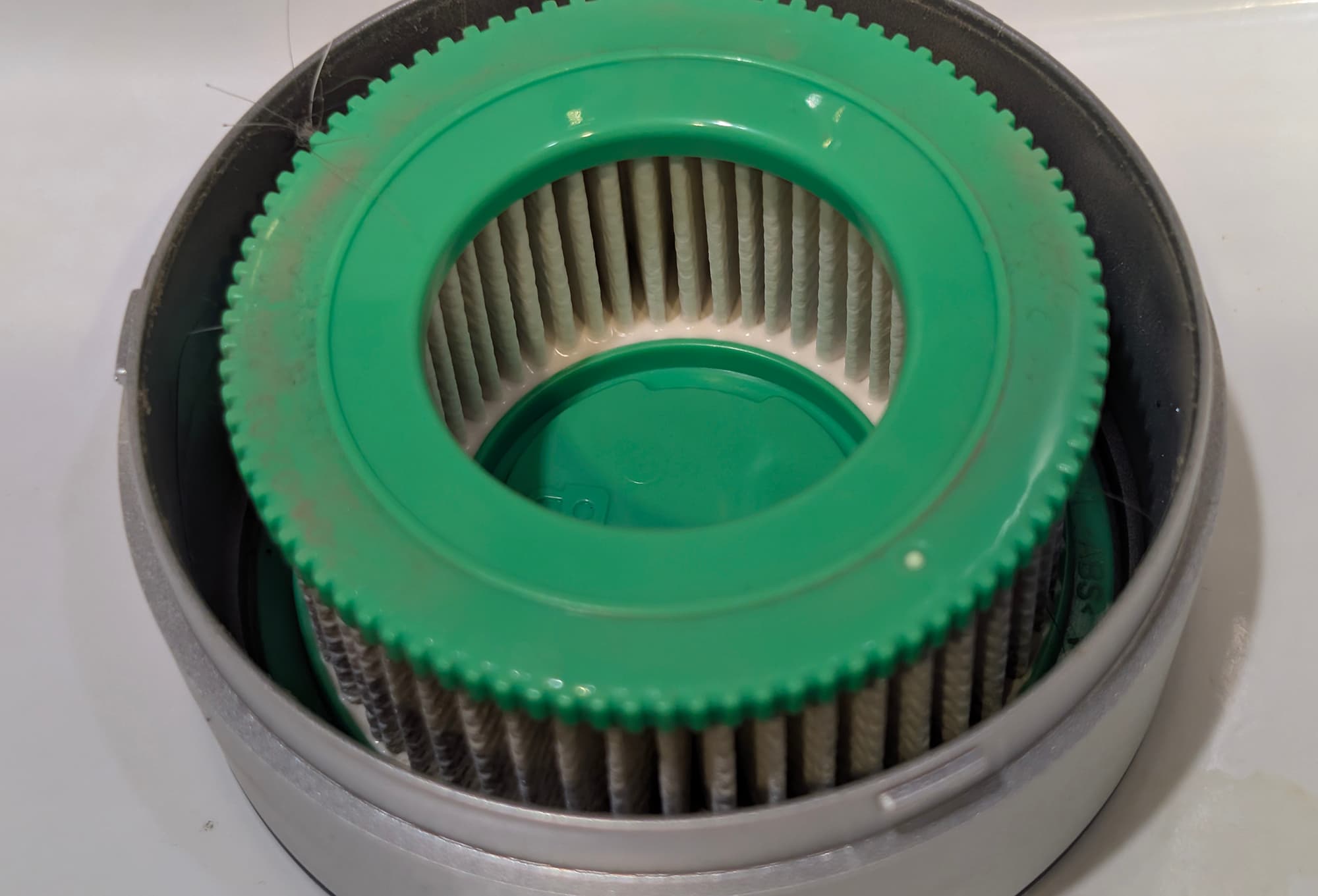 Цилиндрический HEPA-фильтр закреплен в отвинчивающемся корпусе. Для дополнительной защиты двигателя производитель предусмотрел дополнительный элемент из мелкой стальной сетки на конической рамке.