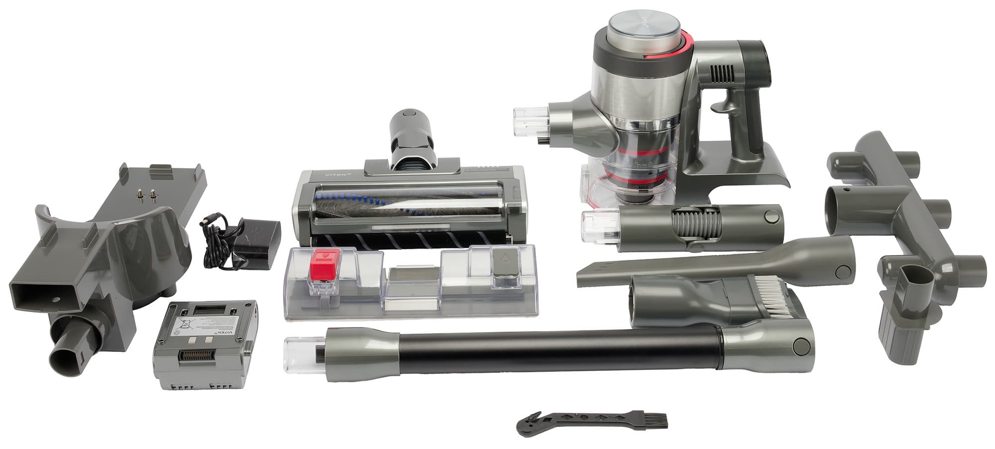 Комплектацию Vitek VT-CLSAQUA Rapid мы оцениваем как среднюю: набора насадок, поставляемых вместе с устройством, должно быть достаточно для решения основных задач по наведению порядка, но о дополнительных расходных материалах (к примеру, салфетках для влажной уборки и фильтре тонкой очистки) производитель не позаботился.