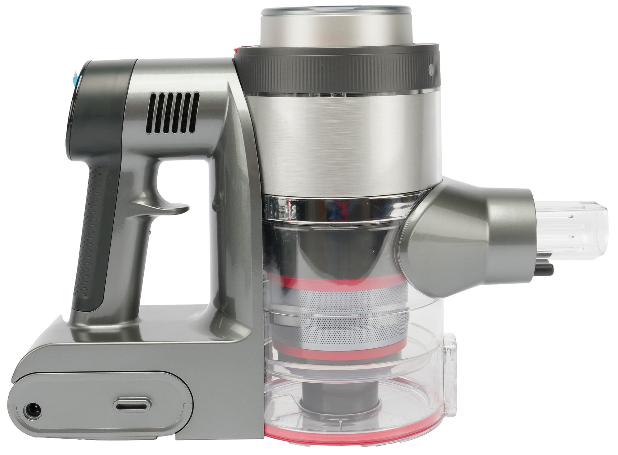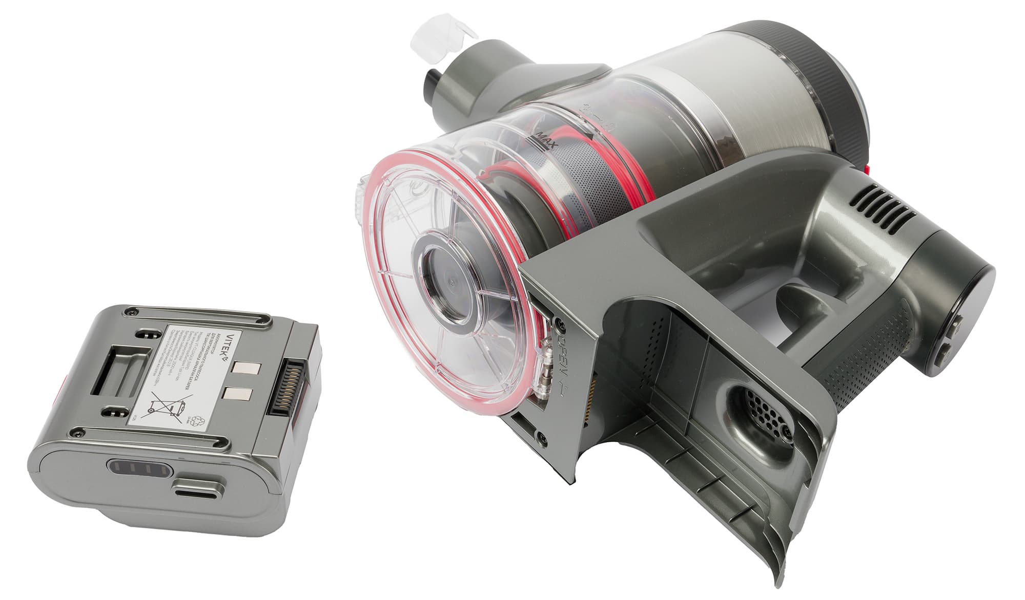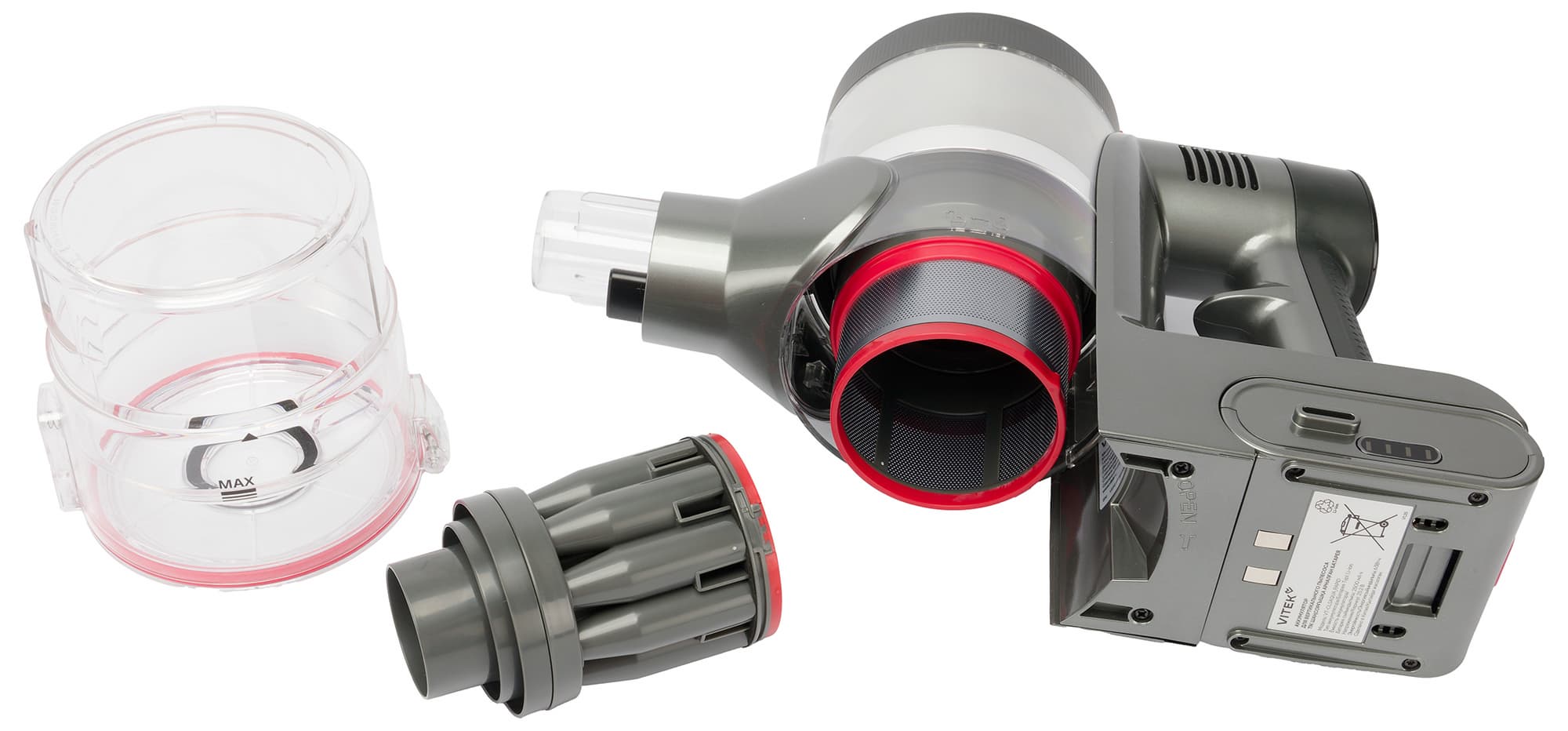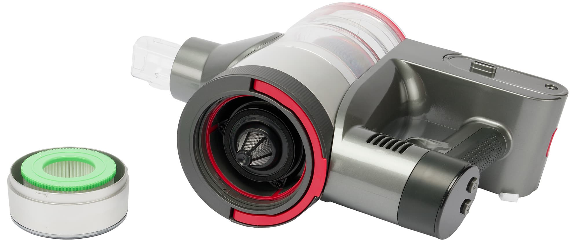 Циклонный фильтр с контейнером для мусора расположен перпендикулярно воздушному тракту. В верхней части корпуса размещен фильтр тонкой очистки, а двигатель установлен ближе к пользователю, над пистолетной рукояткой.