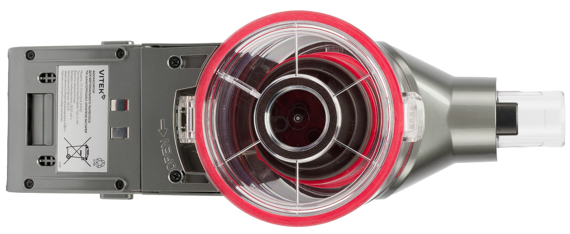 Поток воздуха с пылью и мусором поступает в цилиндрический мусоросборник и закручивается вокруг центрального элемента. Крупные и тяжелые фрагменты остаются внутри контейнера, а средняя фракция оседает на стальной сетке с микроперфорацией. Сквозь нее воздух с мелкой пылью проходит через пластиковый мультициклон и попадает на фильтр тонкой очистки, размещенный в верхней крышке.