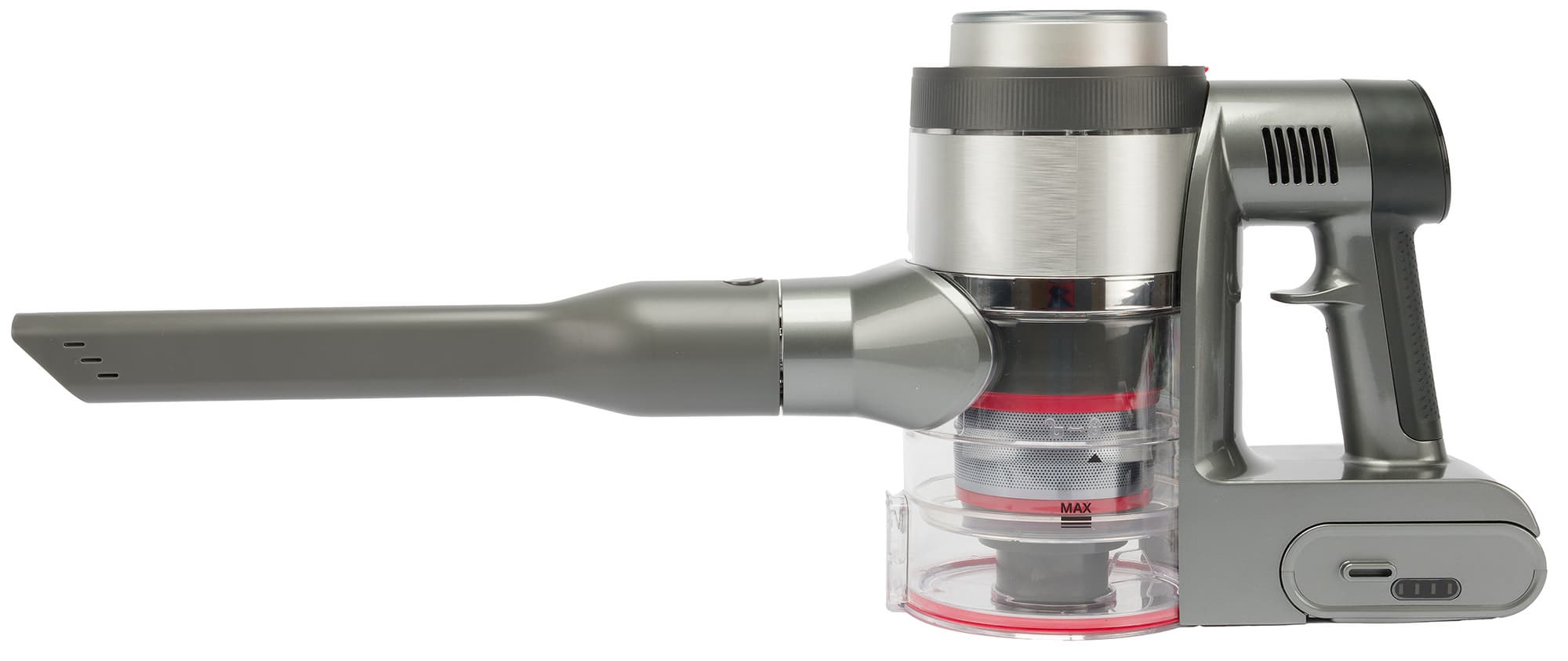 Пылесос удобно лежит в руке: этому способствует выраженный упор для среднего пальца на рукоятке. Устройство неплохо сбалансировано и субъективно не кажется тяжелым (чтобы проверить свои ощущения, чуть позже мы взвесим моторный блок и все аксессуары).