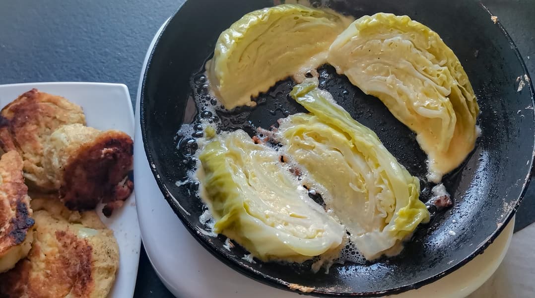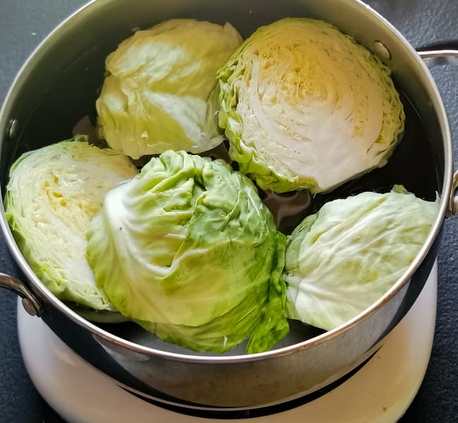 Свежую молодую капусту отварили до полуготовности в подсоленной воде, разрезав кочаны пополам.