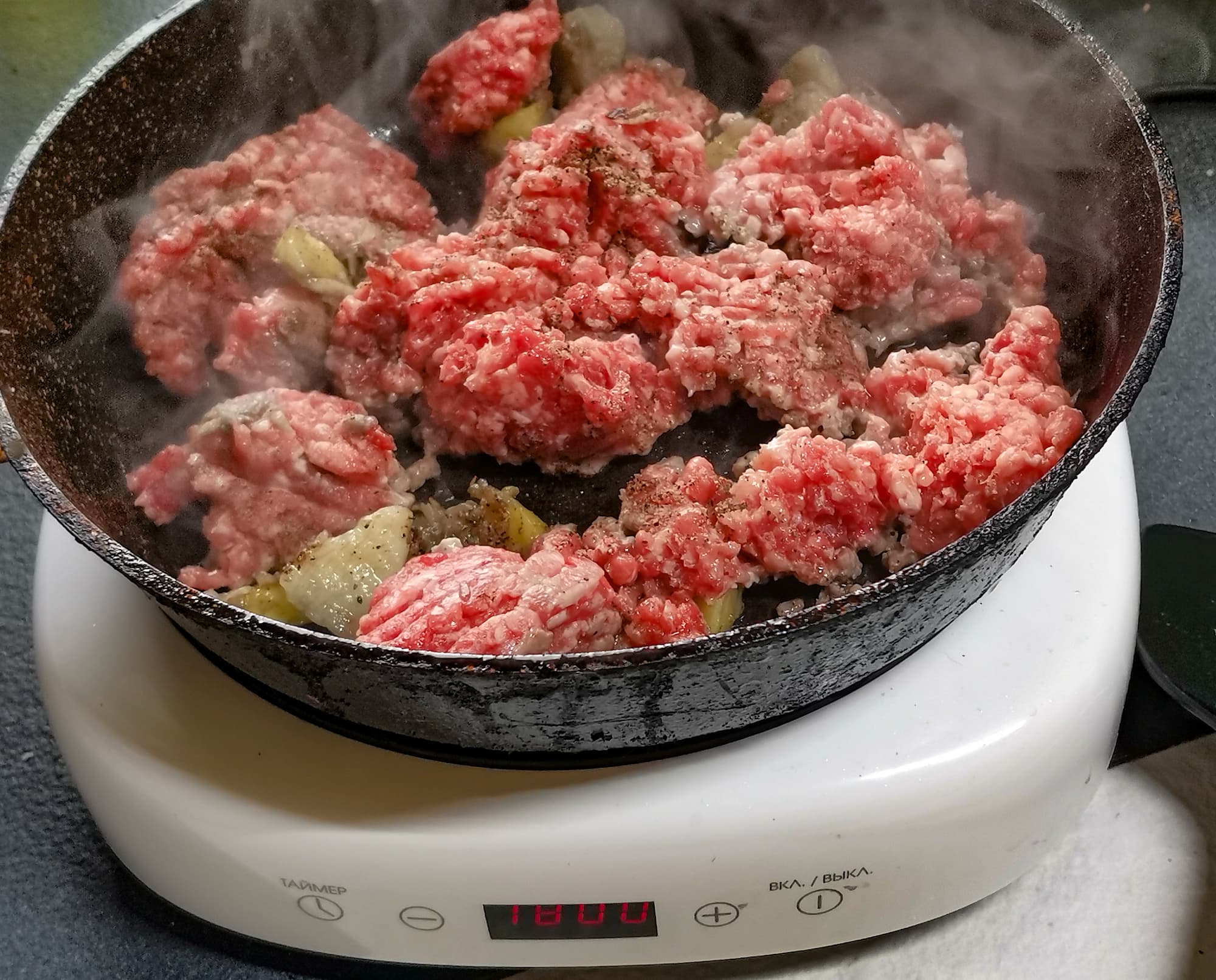 Домашний фарш выложили на разогретую сковородку вместе с луком и специями. Жарили на мощности 1800 Вт, постоянно перемешивая, в течение 5-7 минут.