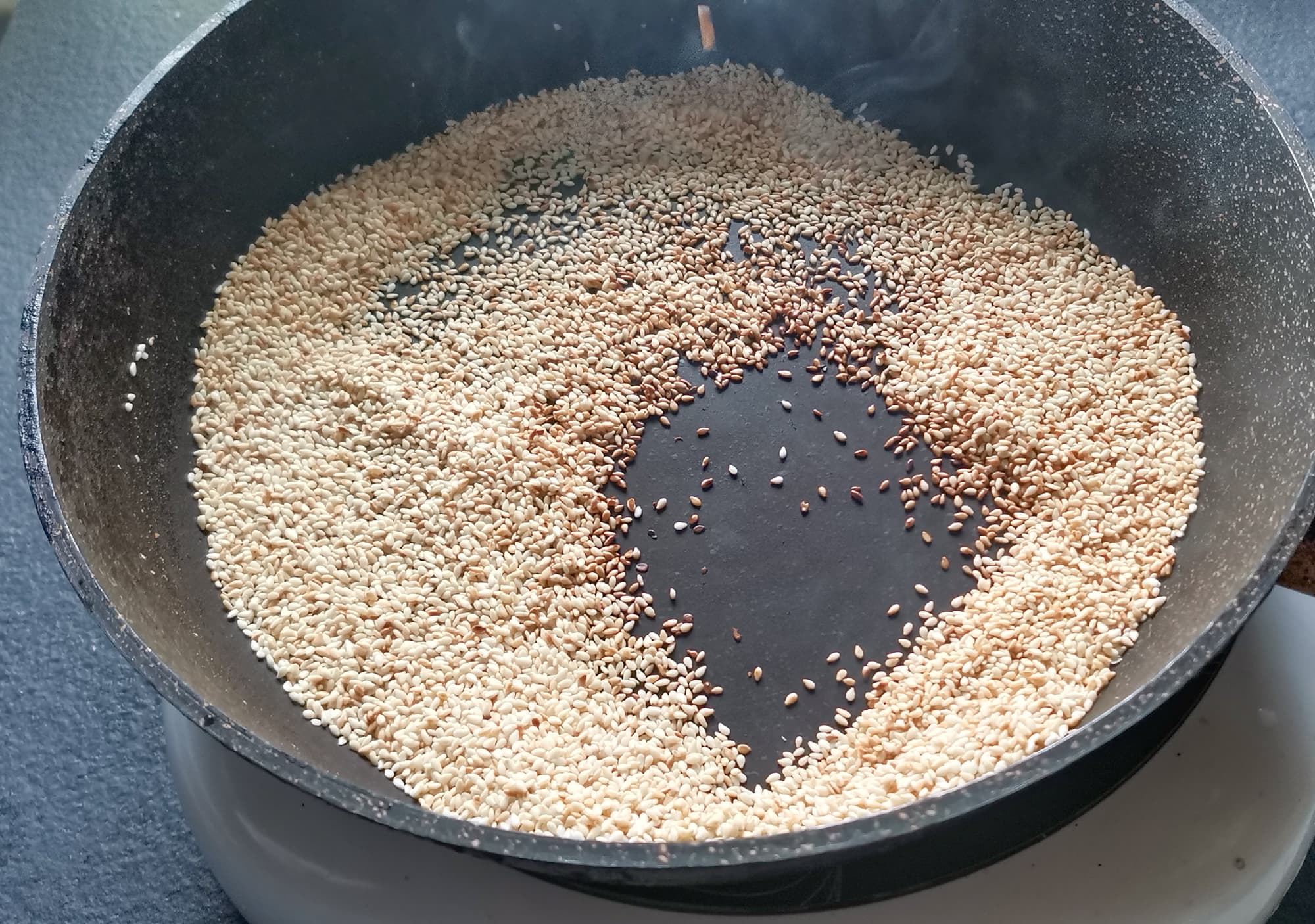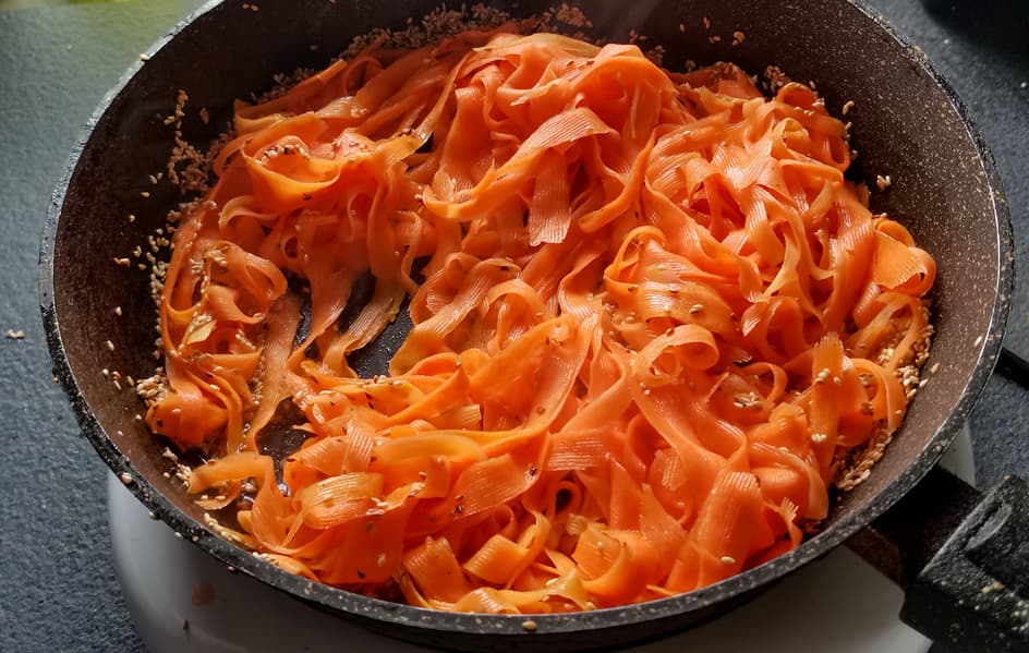 Для корейского салата из моркови подготовили морковь — почистили, нашинковали тонкими полосами, посолили и оставили давать сок. В сухую сковородку насыпали кунжут и довели его на средней мощности до золотистого цвета.