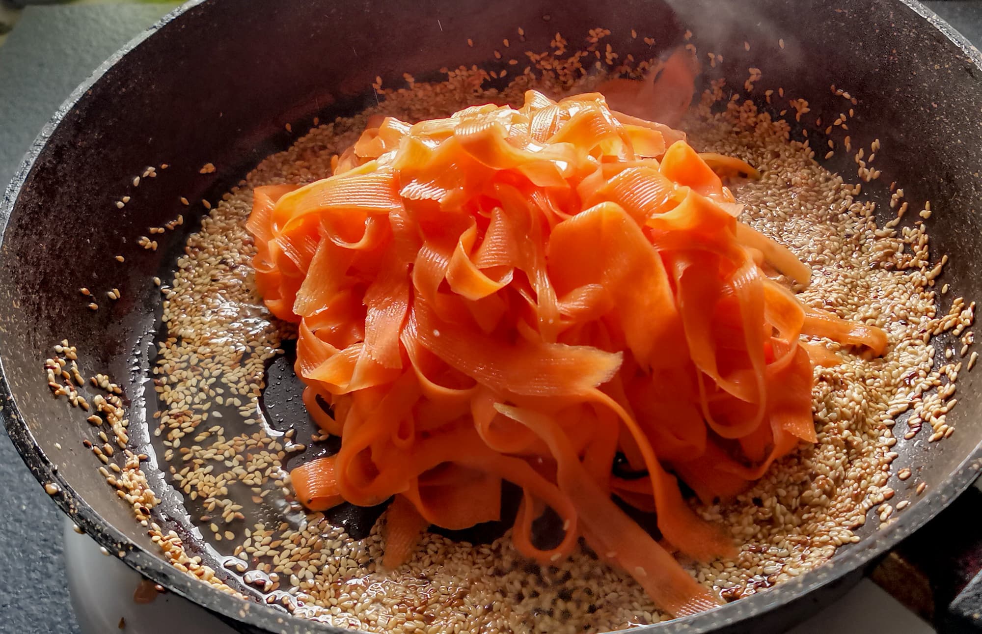 В кунжут налили растительного масла, выложили подготовленную морковь, слегка отжав сок.
