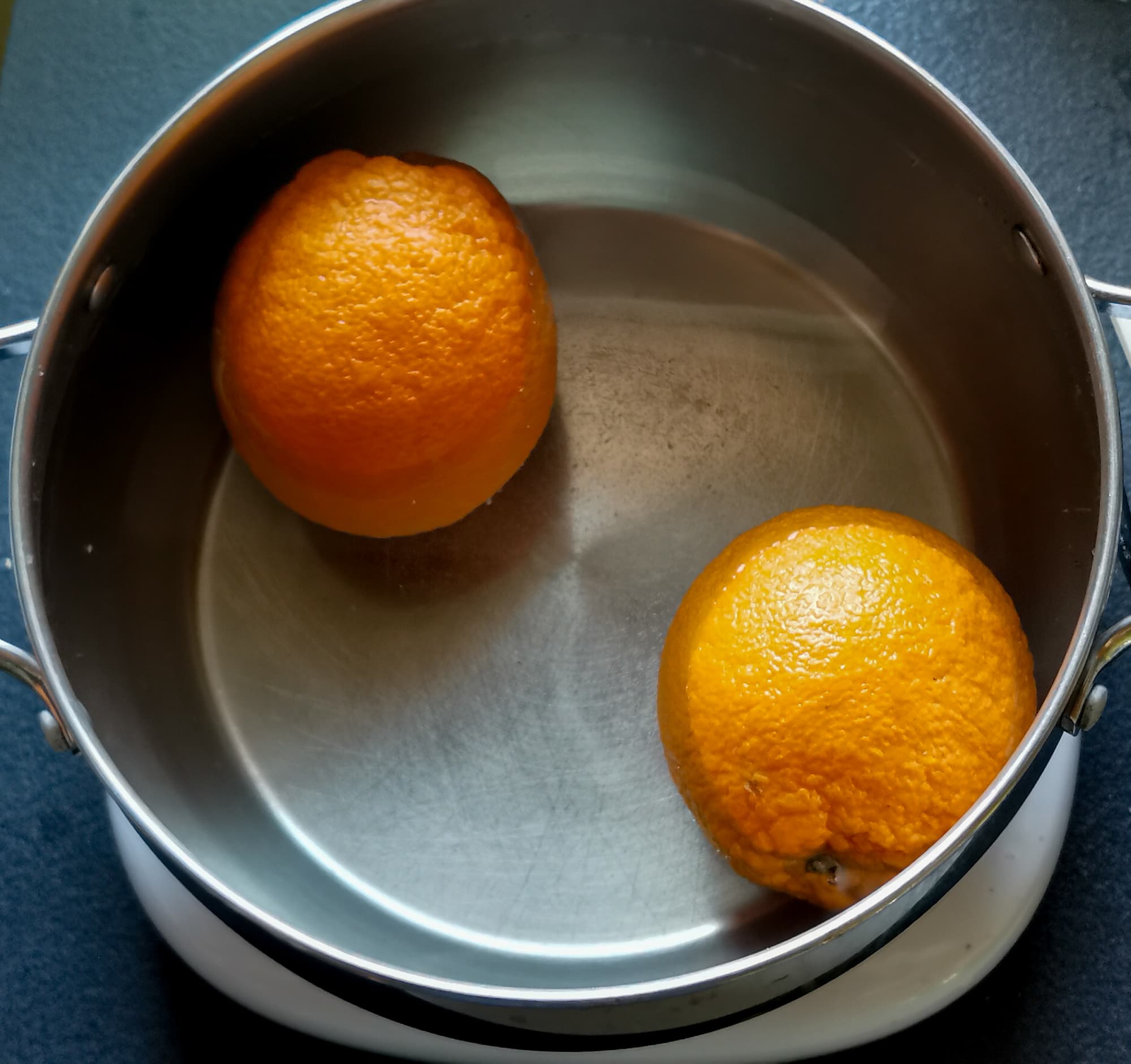 Для приготовления апельсинового джема по быстрому рецепту мы взяли пару больших апельсинов и варили их в воде в течение получаса, сначала выставив максимальную мощность, а после закипания накрыв кастрюлю крышкой и убавив мощность до 500 Вт.