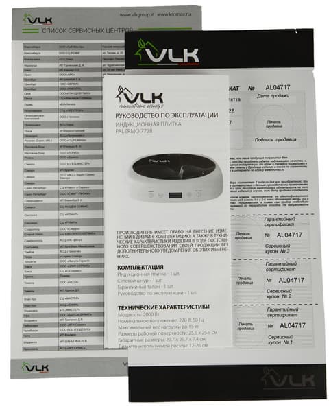 Комплект документов, прилагаемый к плитке, состоит из гарантийного талона и руководства пользователя, напечатанного на одном листе формата А4.