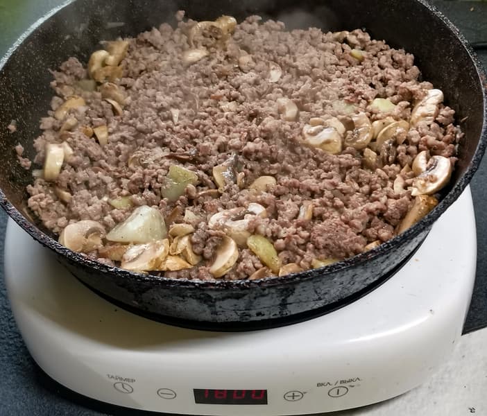 Жареный фарш с луком и шампиньонами