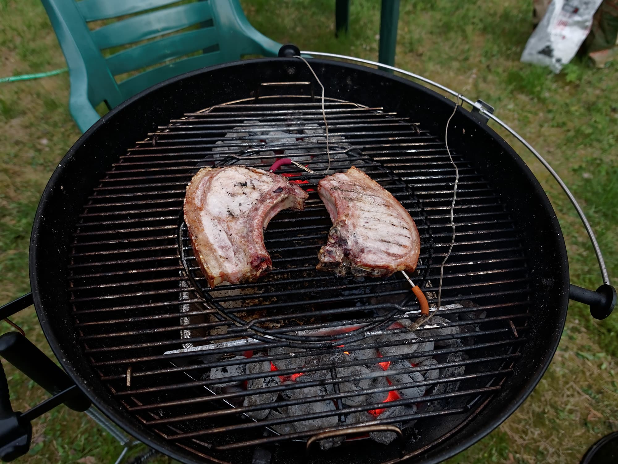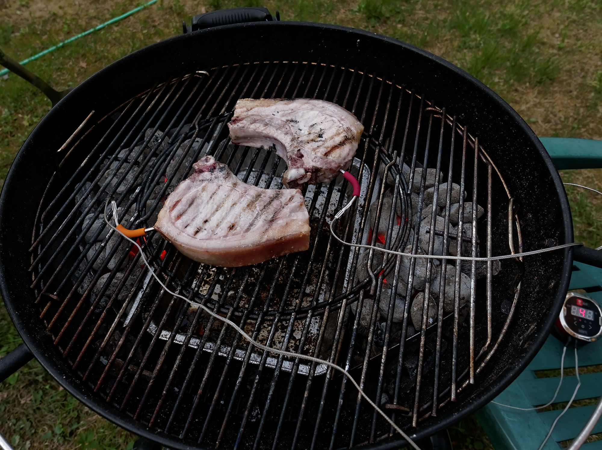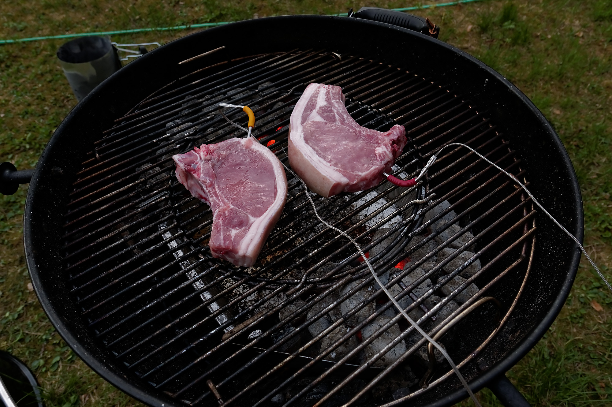 Стартером разожгли угольные брикеты, воткнули щупы iGrill 2 в свинину и поместили отбивные в зону непрямого жара. Запустили приложение, выбрали животное и отруб «свиная отбивная, без кости или с костью», выбрали среднюю прожарку — 62 градуса.