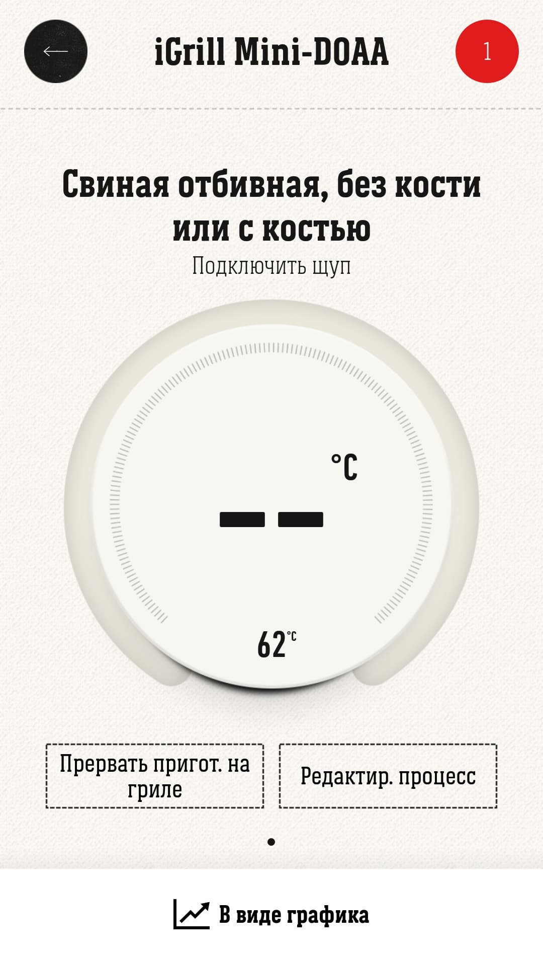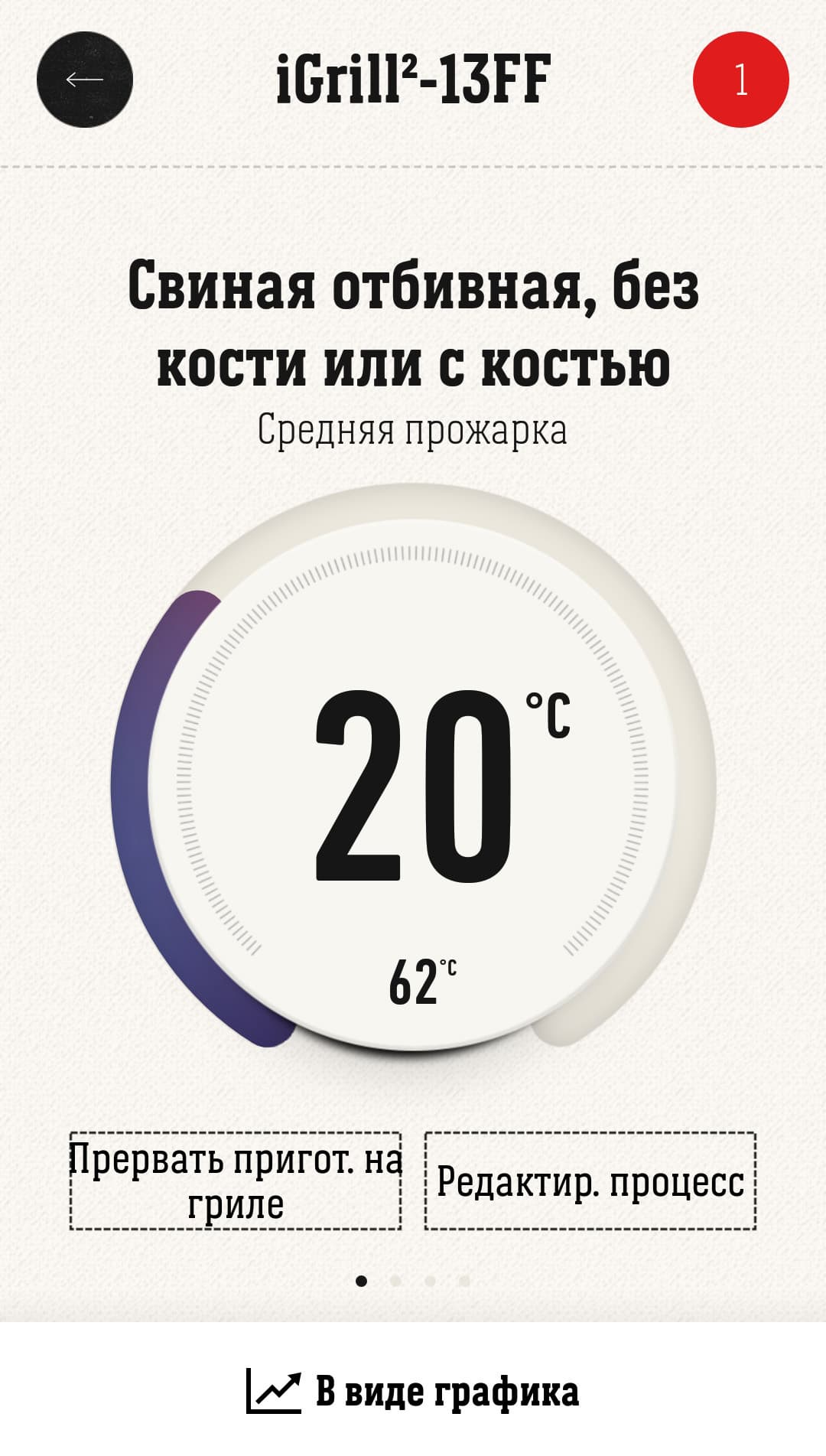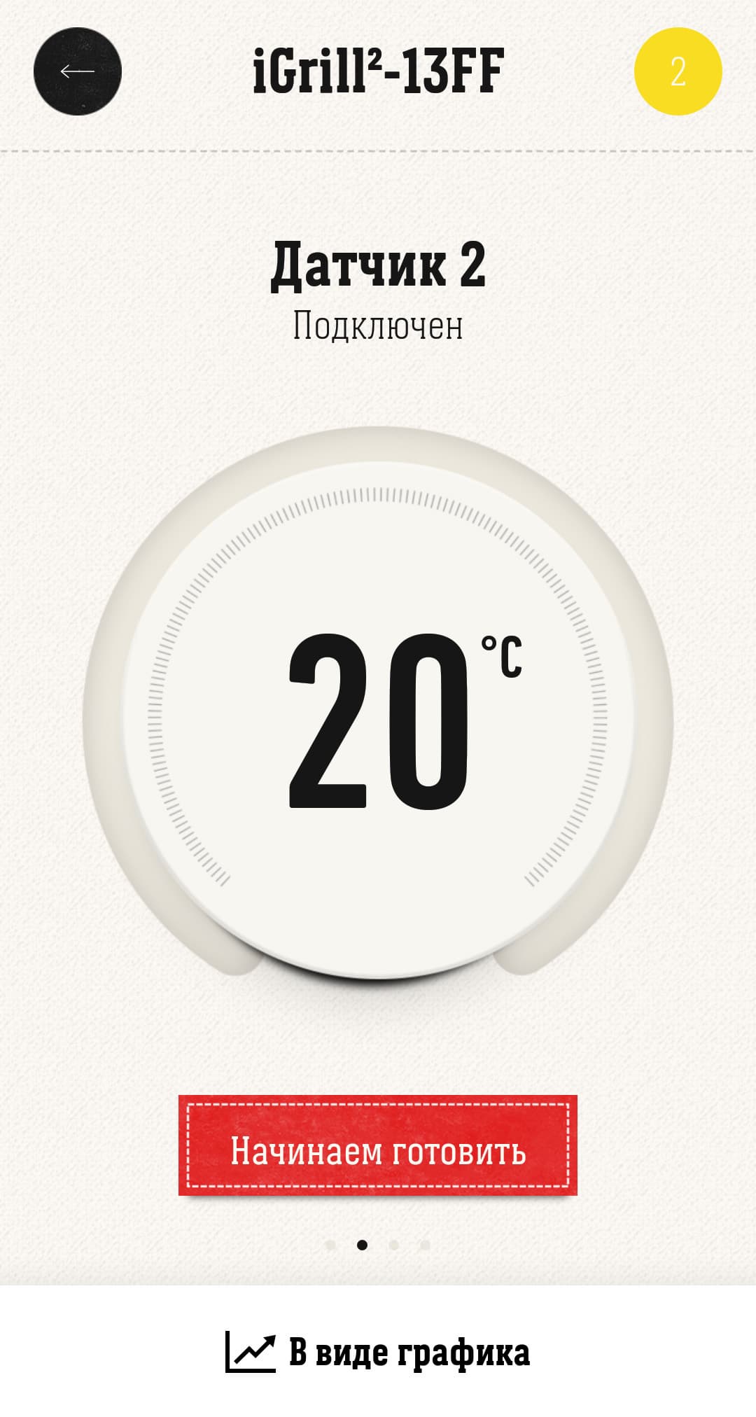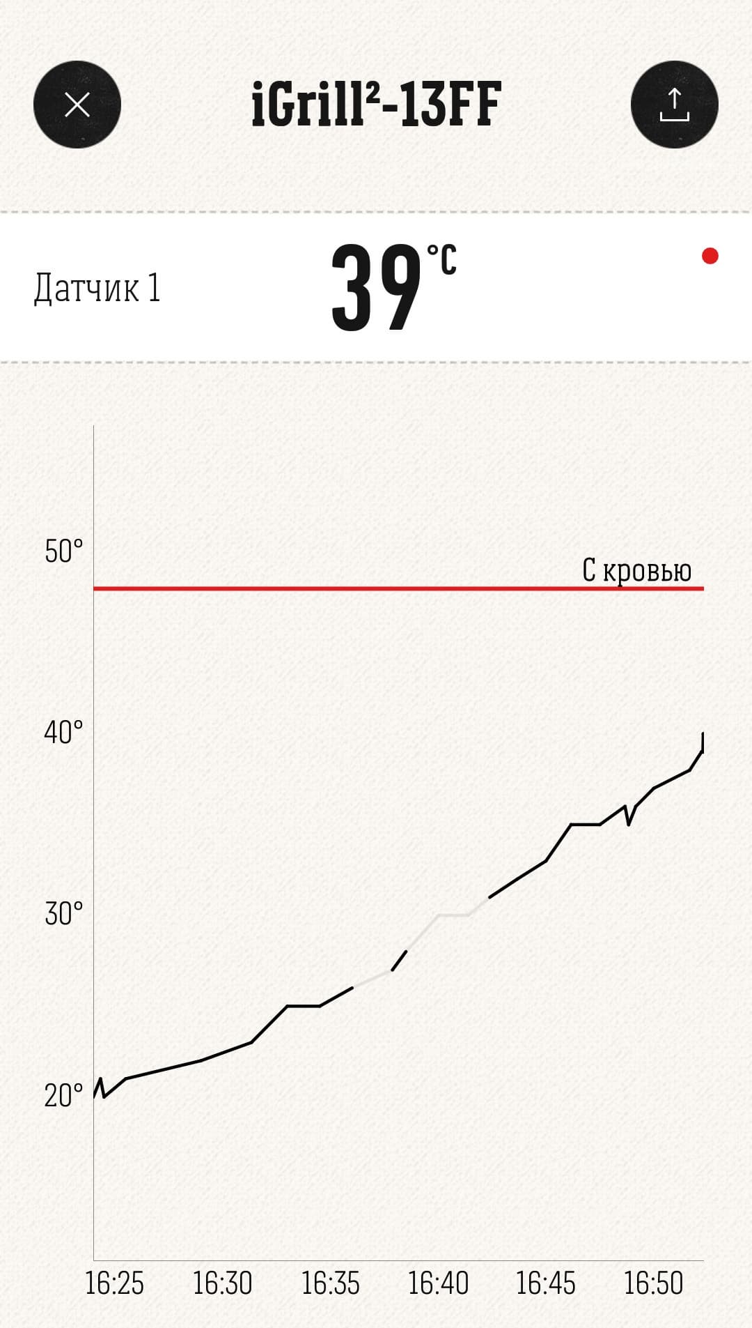 Как видите, мы наблюдаем наименование подключенного устройства, номер датчика (в правом верхнем углу), наименование блюда, выбранную степень прожарки, текущую температуру и температуру окончания процесса. Сейчас еще слишком рано, но когда температура станет побольше, под текущей температурой станет отображаться степень готовности на данный момент времени.