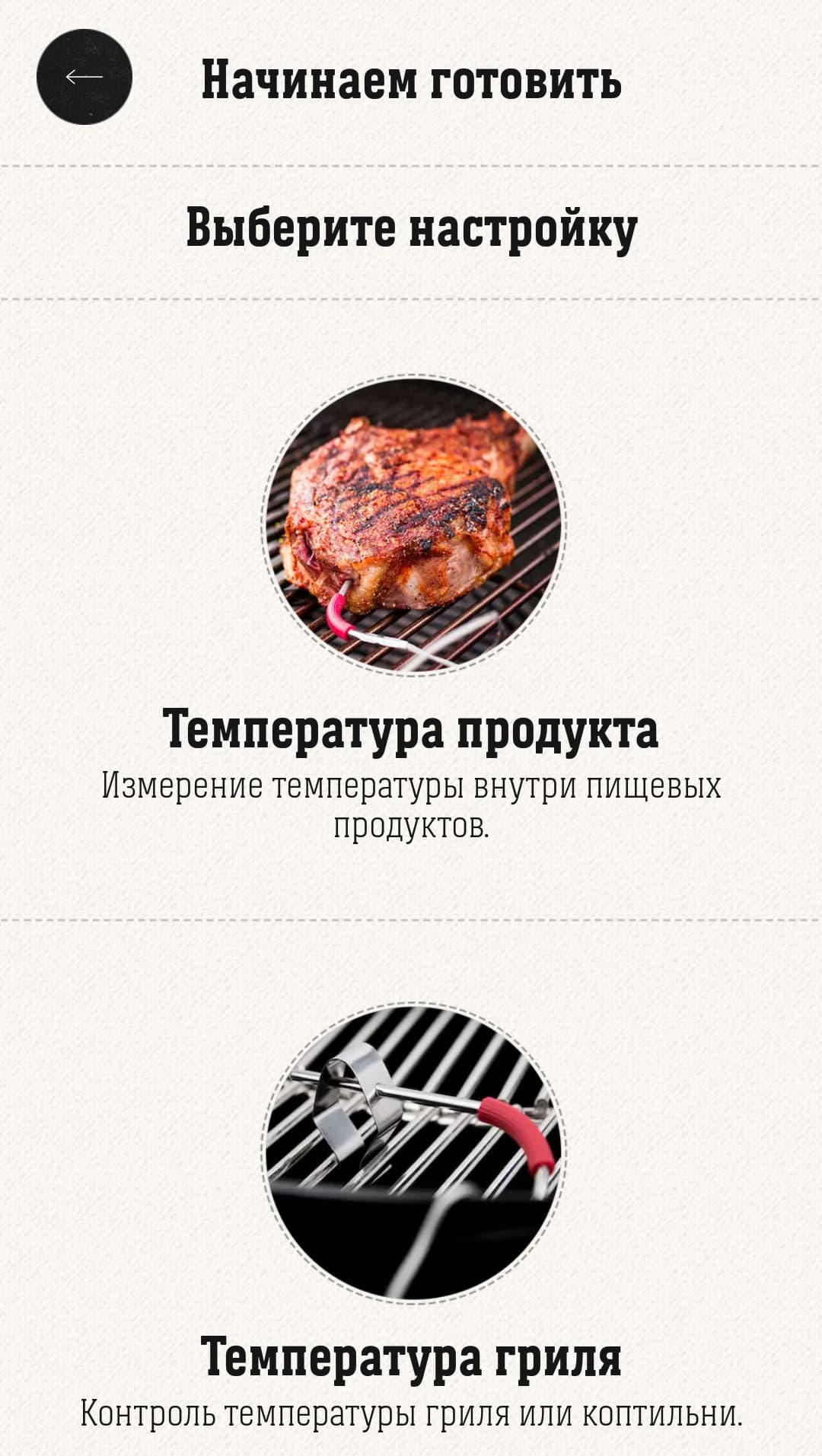 Начинается создание задания с выбора того, что мы собираемся измерять: температуру куска мяса или температуру внутри гриля. Первый вариант является самым распространенным, поэтому мы протестировали именно его (к тому же, температуру внутри гриля, пусть и не дистанционным способом, можно узнать, взглянув на его встроенный механический термометр).