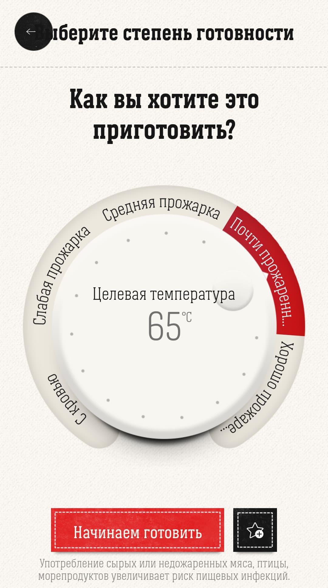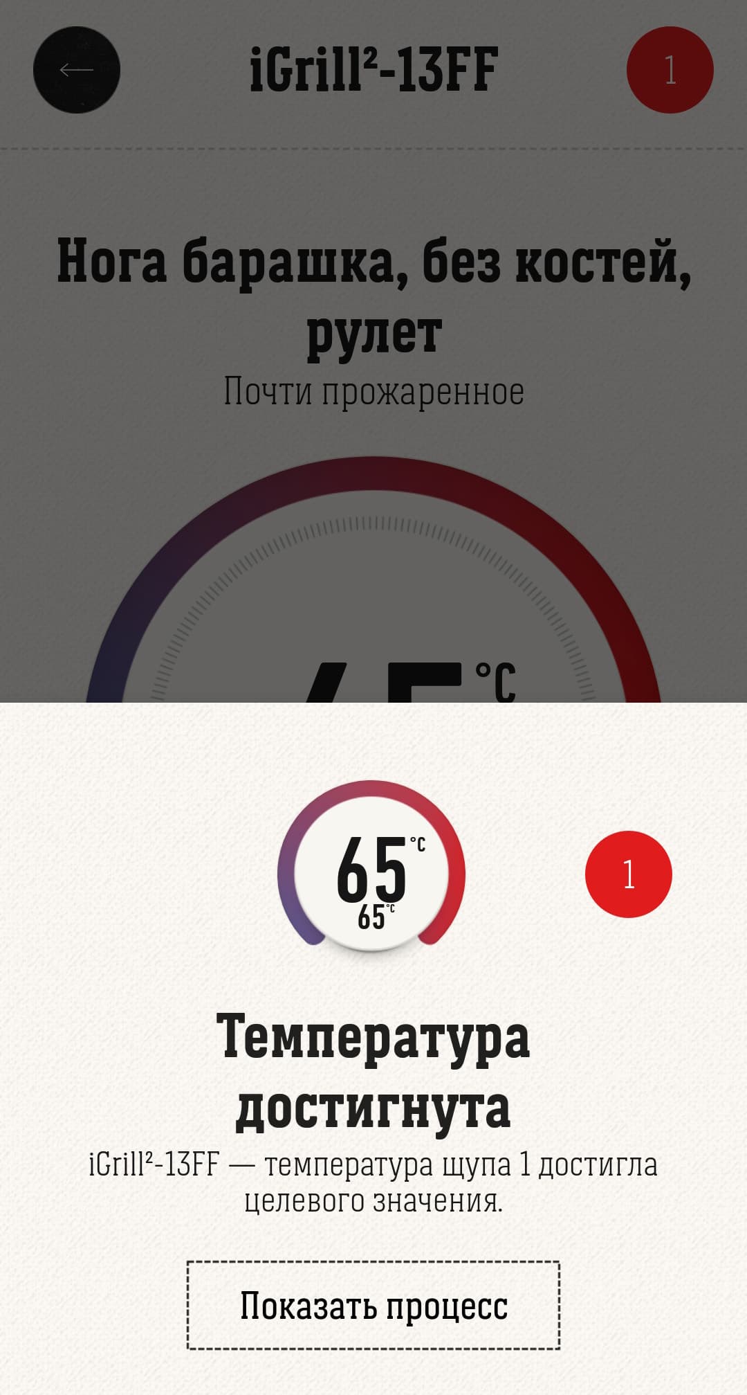 За четыре градуса до готовности того куска, который поспевает первым, смартфон издает предупредительный сигнал о том, что пора готовиться к сниманию куска. По достижении заданной температуры — еще один сигнал.