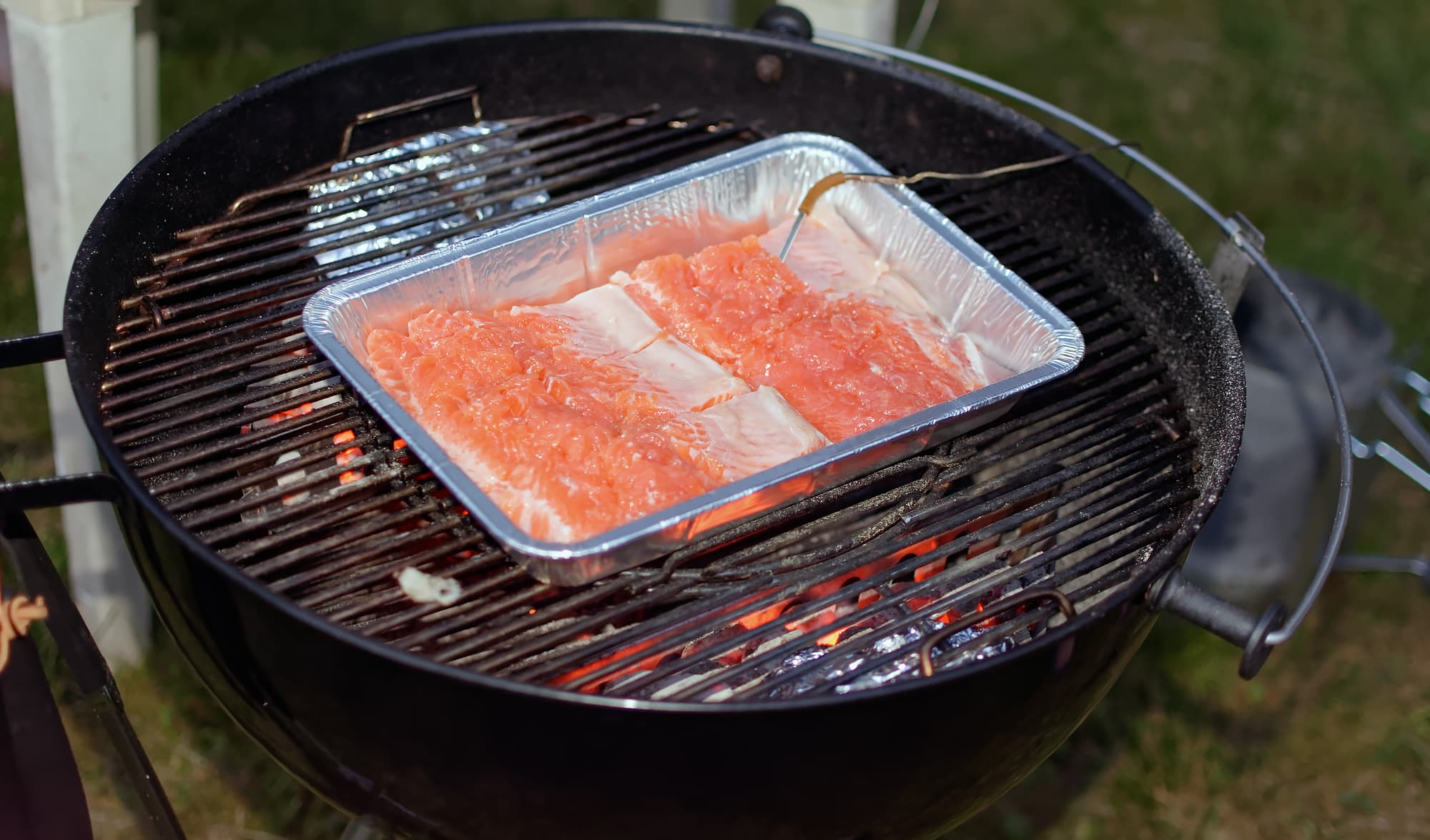 Помещаем нашу рыбу прямо в противне в режим непрямого жара с веточками яблони в фольге, которые позволят слегка подкоптить продукт.
