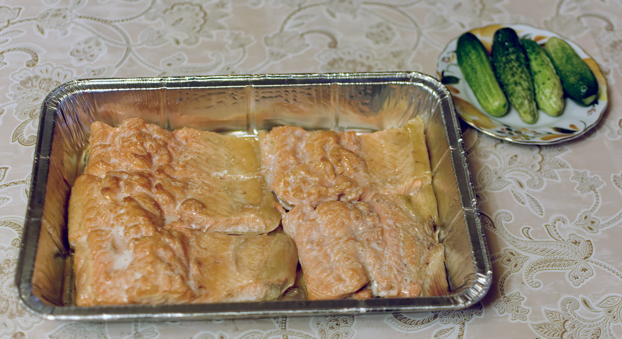 Затем перешли к рыбе. Понятно, что гриль с горячим копчением любую рыбу сделает вкусной, но мы опробовали праздничный вариант: филе лосося. Никаких специй не использовали, просто немного соли. Куски рыбы сложили в противень из фольги.