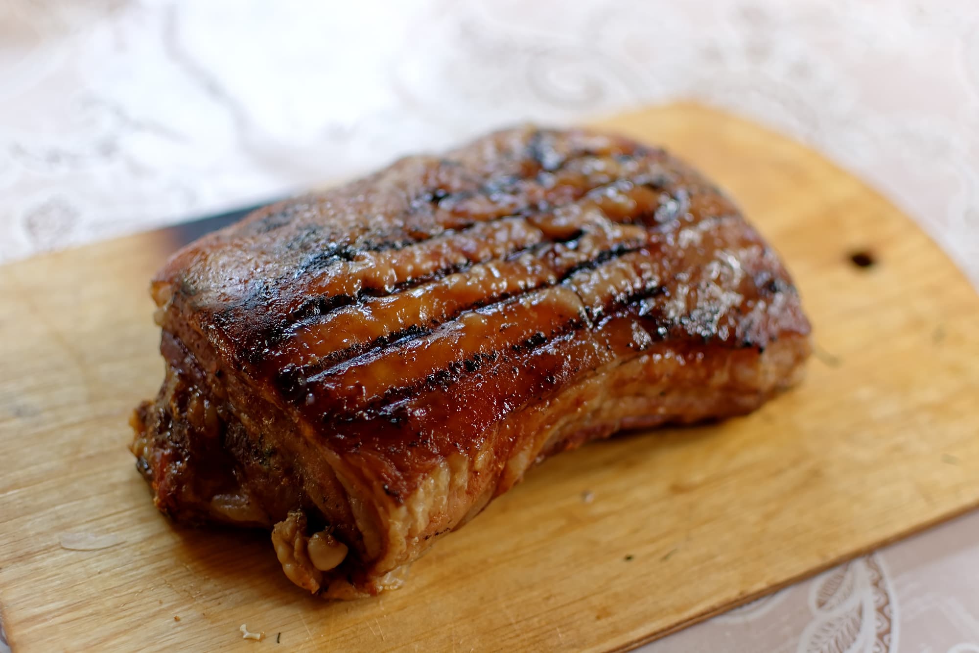 Наша корейка готова: мясо внутри осталось сочным, а шкурка снаружи покрылась мелкими пузырями и стала хрустящей.
