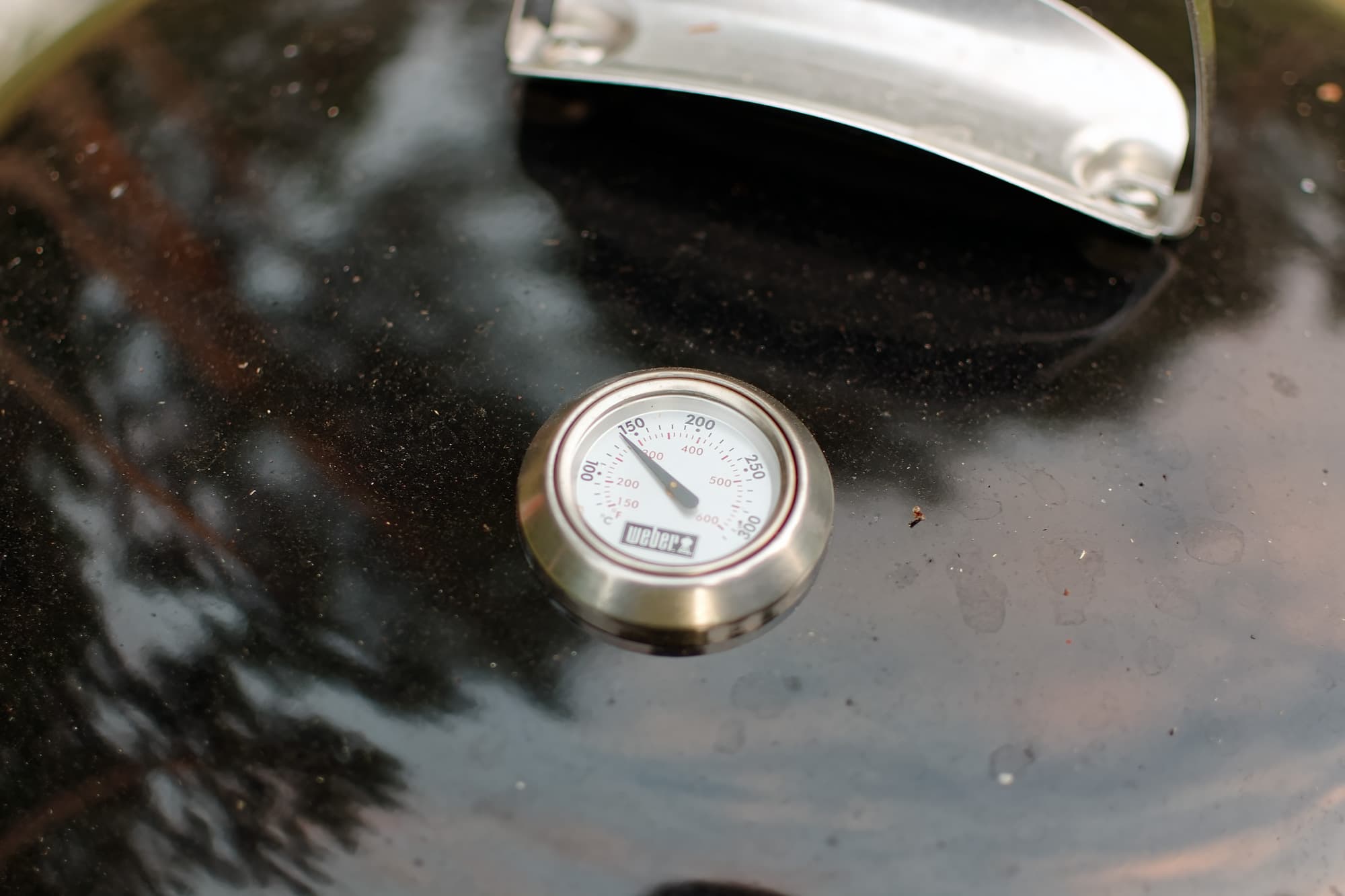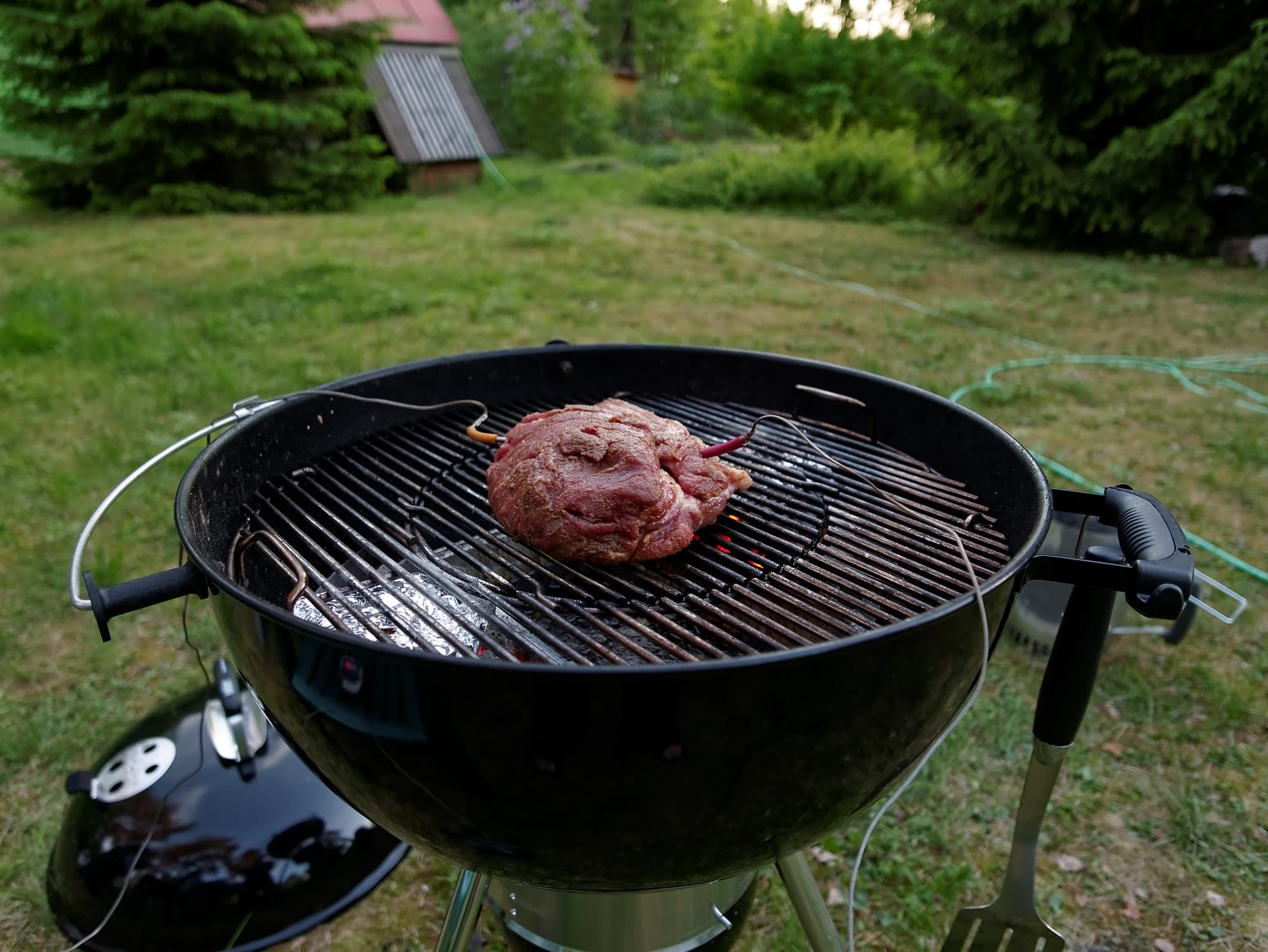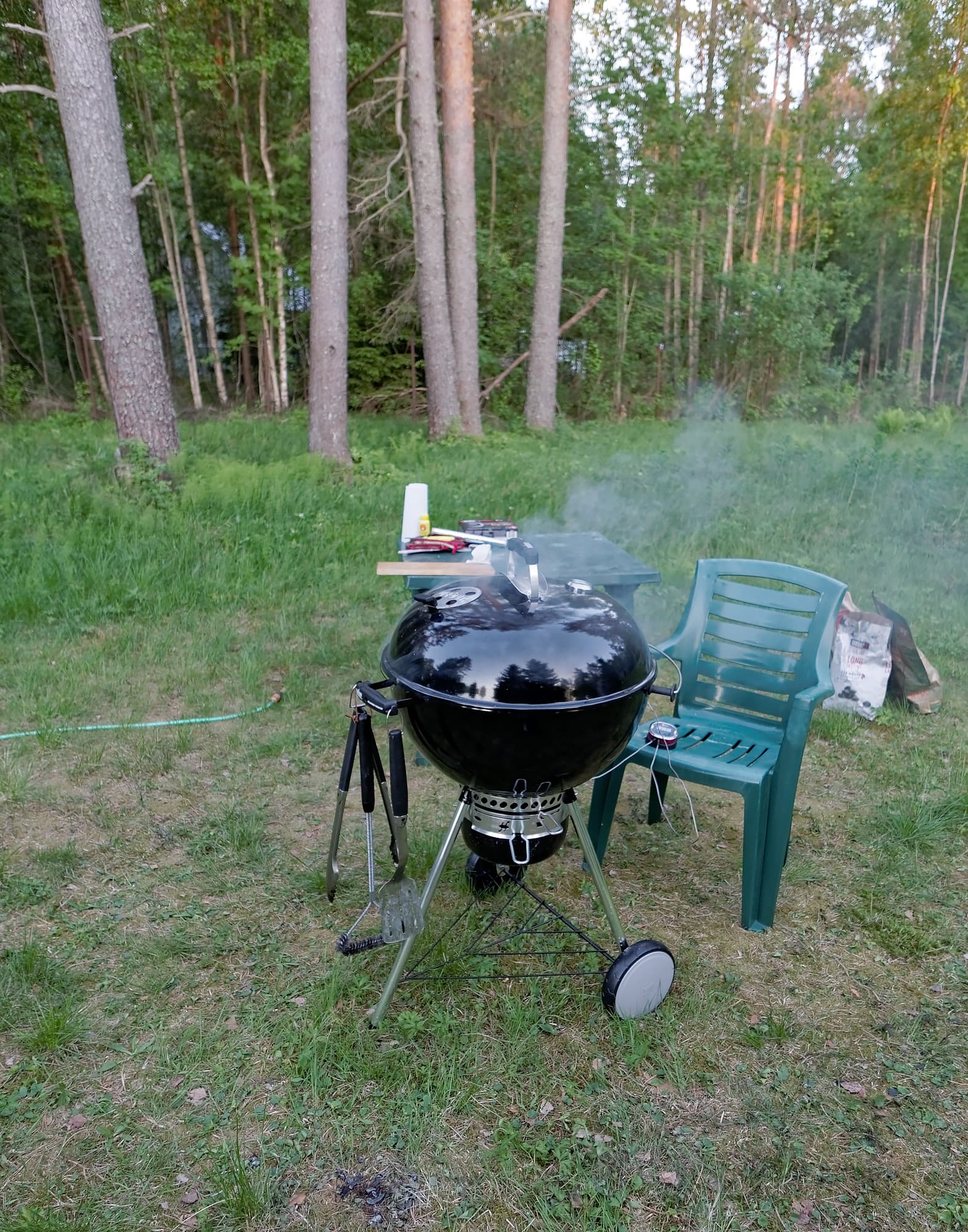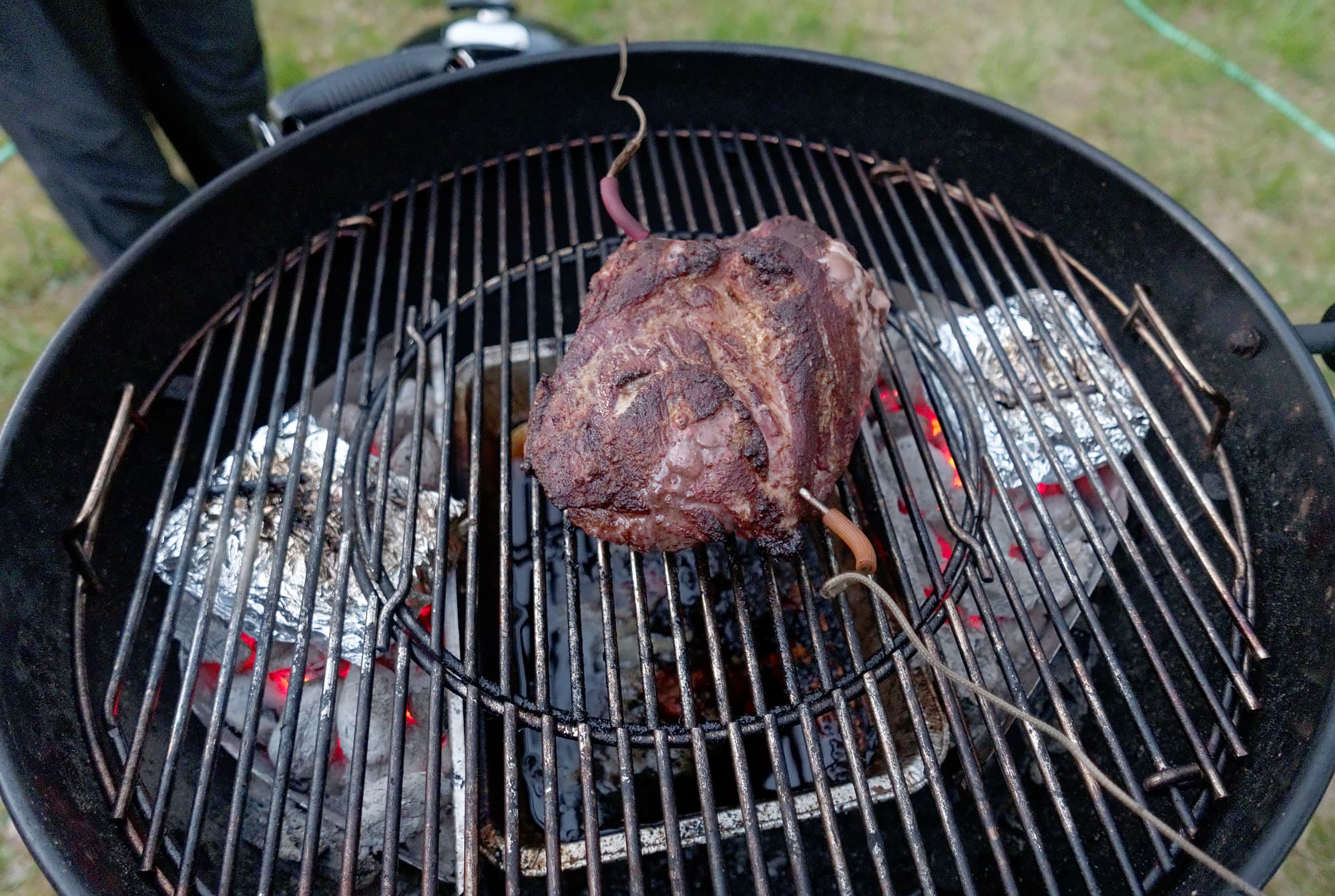 В процессе приготовления мясо один раз перевернули: никакой практической необходимости в этом при использовании сферического гриля и непрямого жара, конечно, нет, но нам было уж очень интересно заглянуть под крышку.