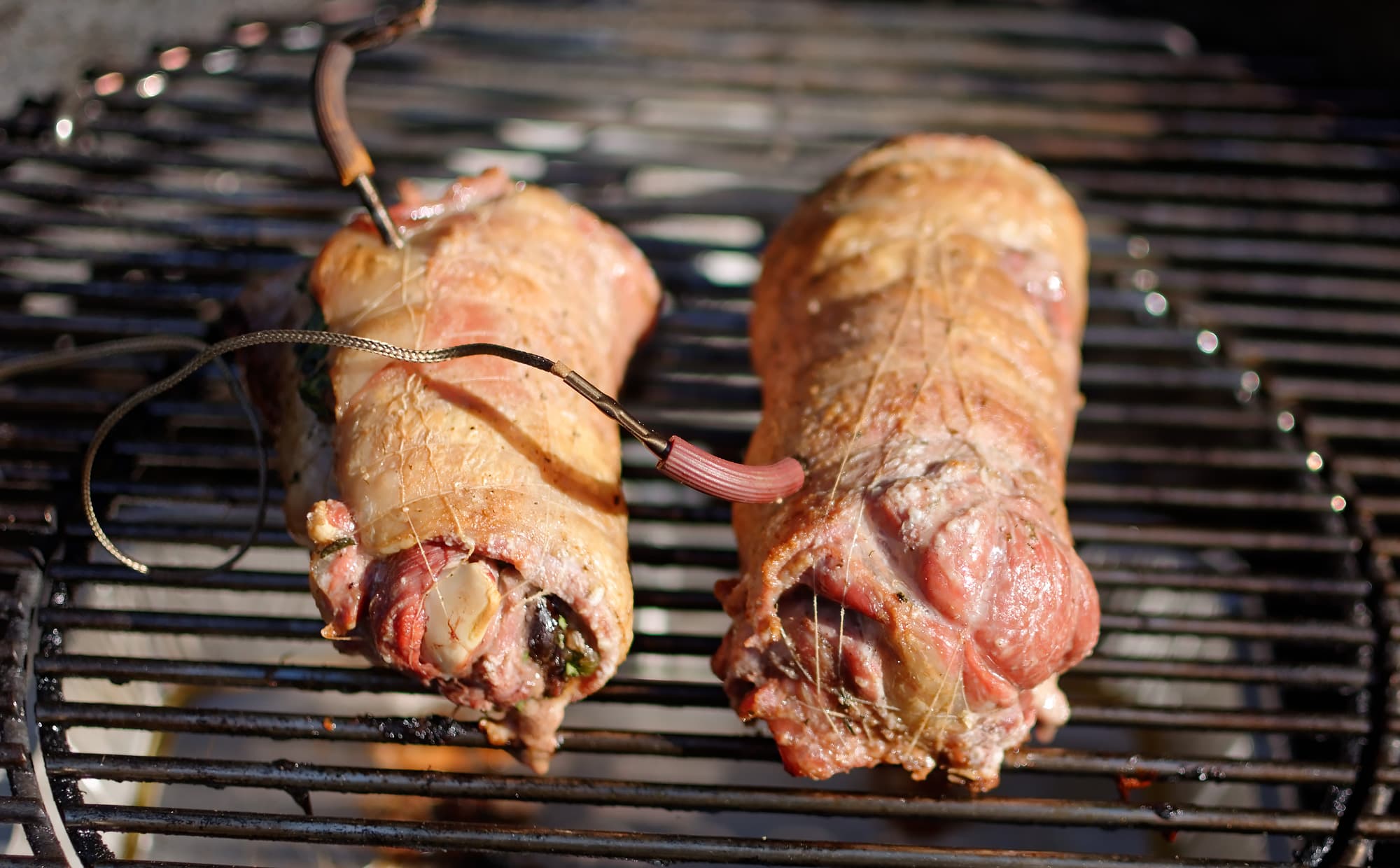 Мы не ставили перед собой сложных кулинарных задач и сосредоточились на том, что было бы очень сложно без iGrill и стало совсем легко с применением электронного термометра. В блюдах, где достаточно одного щупа (например, цыпленок или кусок свиного окорока), мы использовали iGrill Mini, а при приготовлении двух кусков одновременно (например, порционные куски свиной корейки, ростбифов и рулетов из ягнятины) — iGrill 2 с двумя щупами.