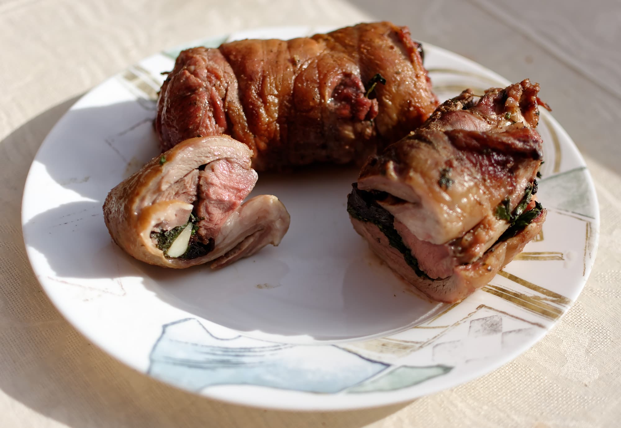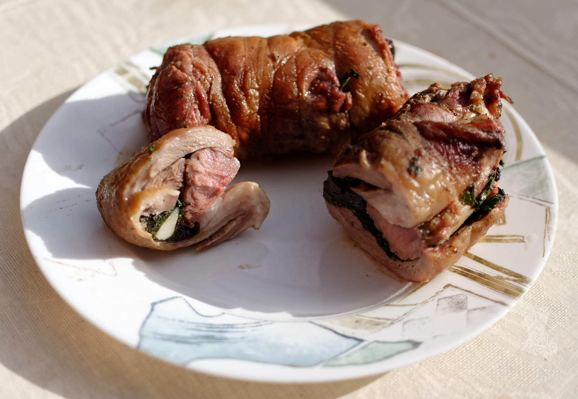 Из двух лопаток молодого ягненка вынули кости, распластали получившееся мясо, посолили, поперчили, поместили внутрь по горсти нарезанной пряной зелени (кинзы и базилика), по несколько черносливин и паре зубчиков чеснока.