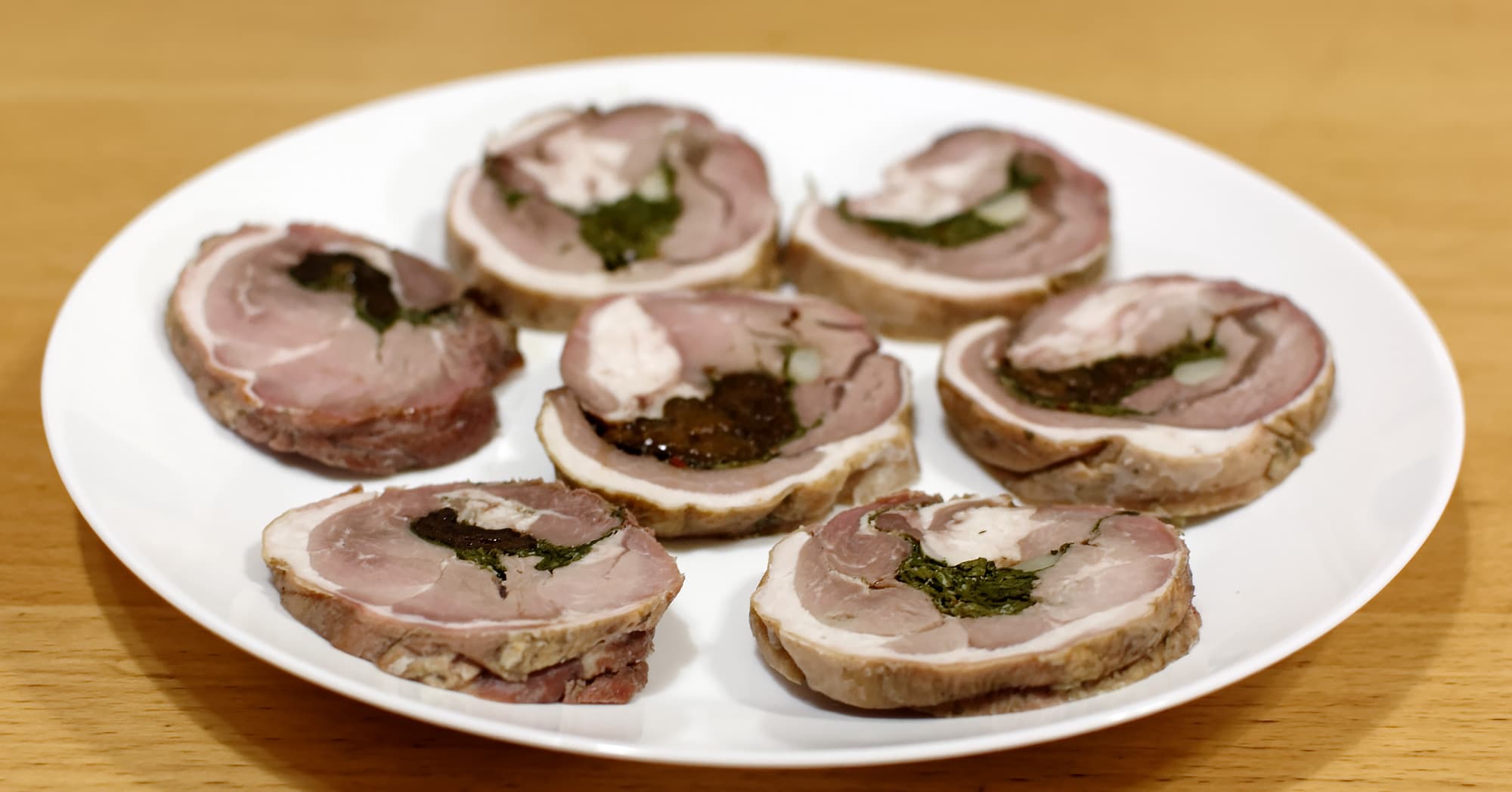 Но нет: идеальный срез с легкой розоватостью, при откусывании из мяса норовит брызнуть сок, присутствует аппетитный аромат слегка подкопченного. В холодном виде мясо можно нарезать на тоненькие бутербродные пластины, оно не ломается и не крошится.