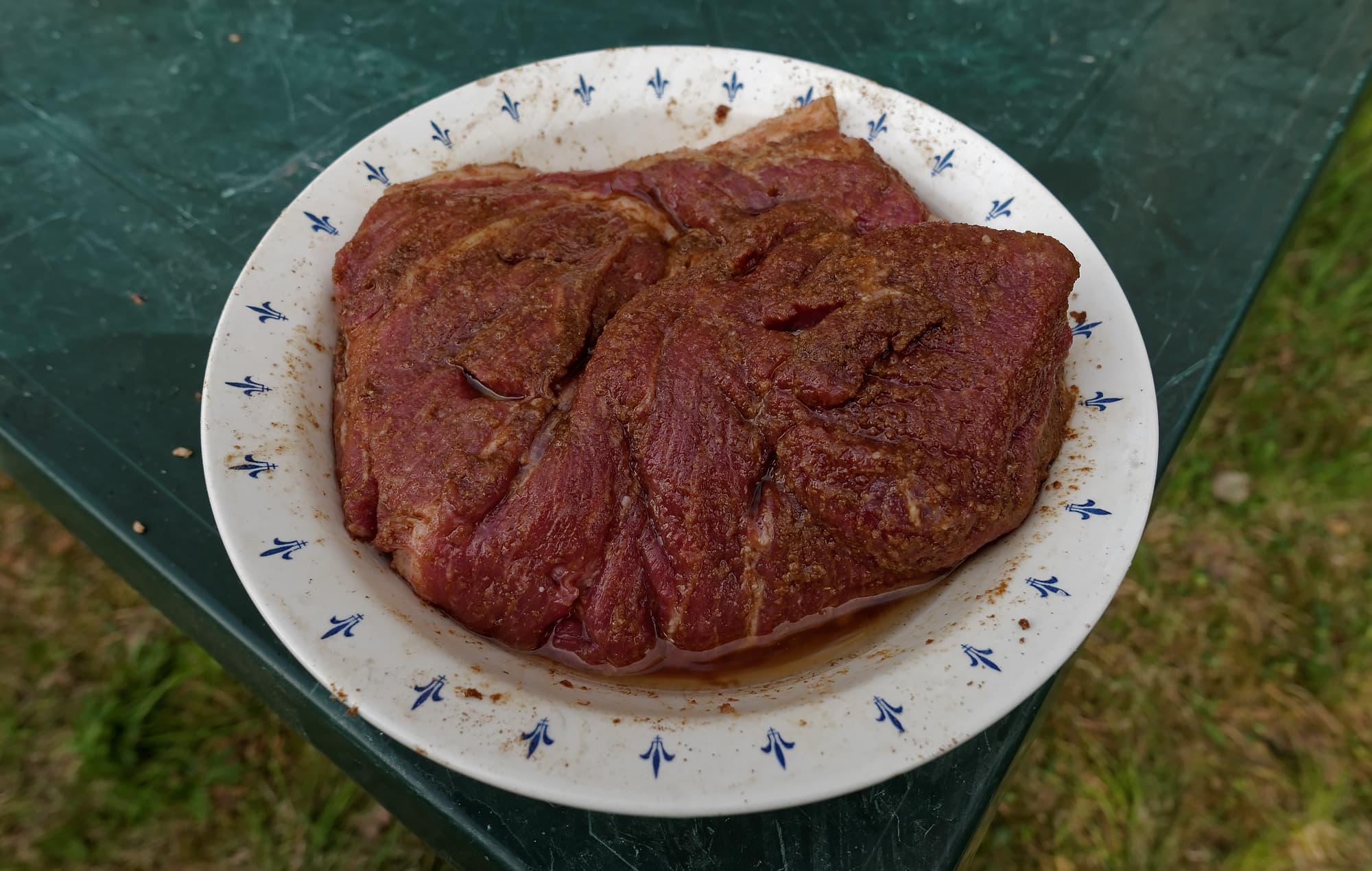 Для следующего теста мы взяли кусочек свиной шеи весом примерно в 1,7 кг. Замариновали мясо в смеси соли, сухой аджики и растительного масла и оставили в холодильнике на сутки.
