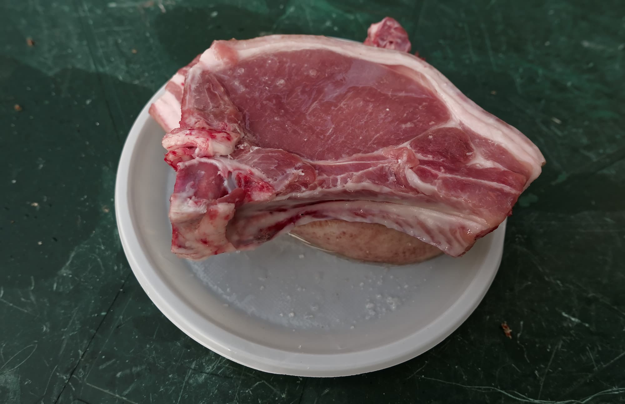 Два куска свиной корейки на шкурке и с костью посолили крупной солью и смазали рафинированным маслом, чтобы из нежной мякоти не испарялась лишняя влага.