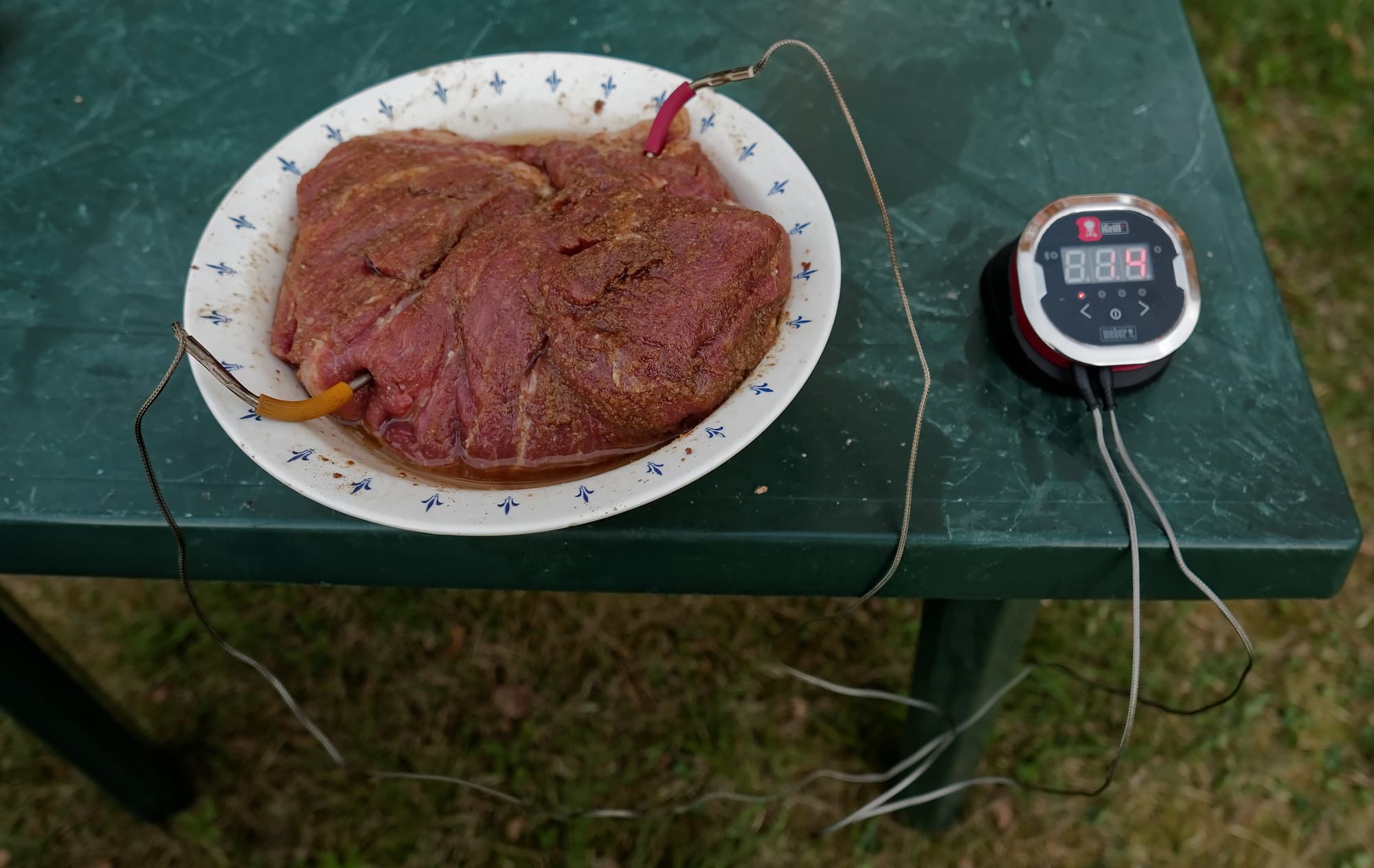 Воткнули в каждый кусок по щупу, задали разную степень прожарки: для большего куска — среднюю прожарку (60 градусов), для меньшего — почти прожаренное (65 градусов). Выбор отруба в приложении нас поначалу пугал, но, покопавшись в предложениях по температуре различных отрубов, мы поняли, что для стейков и для кусков целиком она по каждой из прожарок всегда одинаковая. Так что выбрали ростбиф из рибая, звучит приятно.