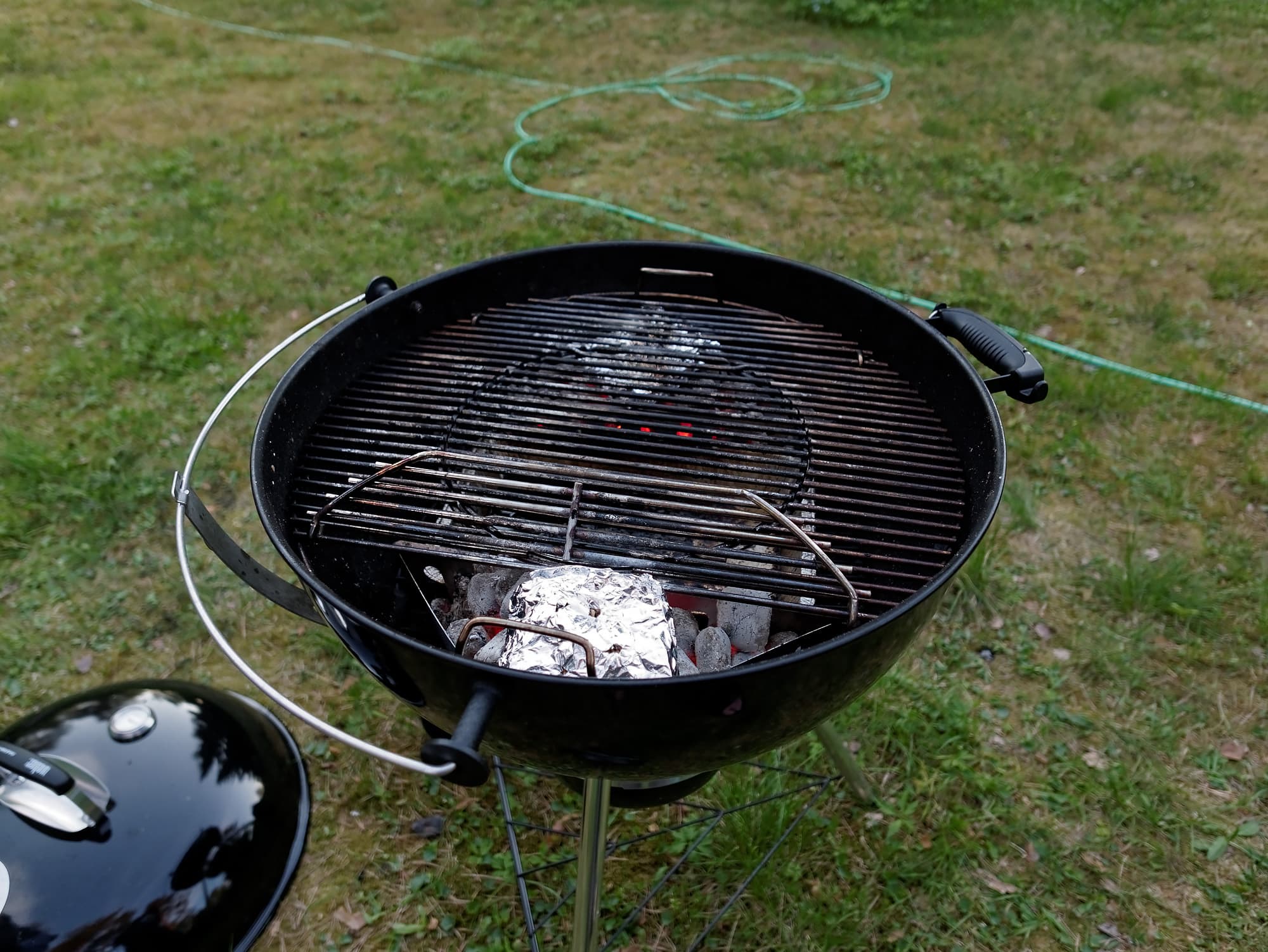 Два лотка с углями, в середине — фольгированный поддон для сбора сока и жира. Мясо решили подкоптить, для чего поместили щепу фруктового дерева (наломали веток смородины и яблони на участке, фирменные щепки и чурочки Weber мы еще потестируем, но пока они к нам не приехали) в небольшой комок фольги. В последнем проделали дырочки для выхода дыма.