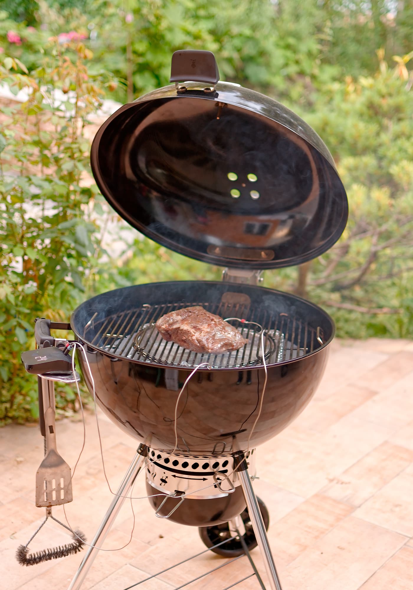 Далее устанавливаем решетку и кладем на нее кусок говядины, заранее выдержанной в соли и специях (в нашем случае специями выступила просто смесь пяти перцев). Температуру внутри куска, как обычно, контролируем термометром.
